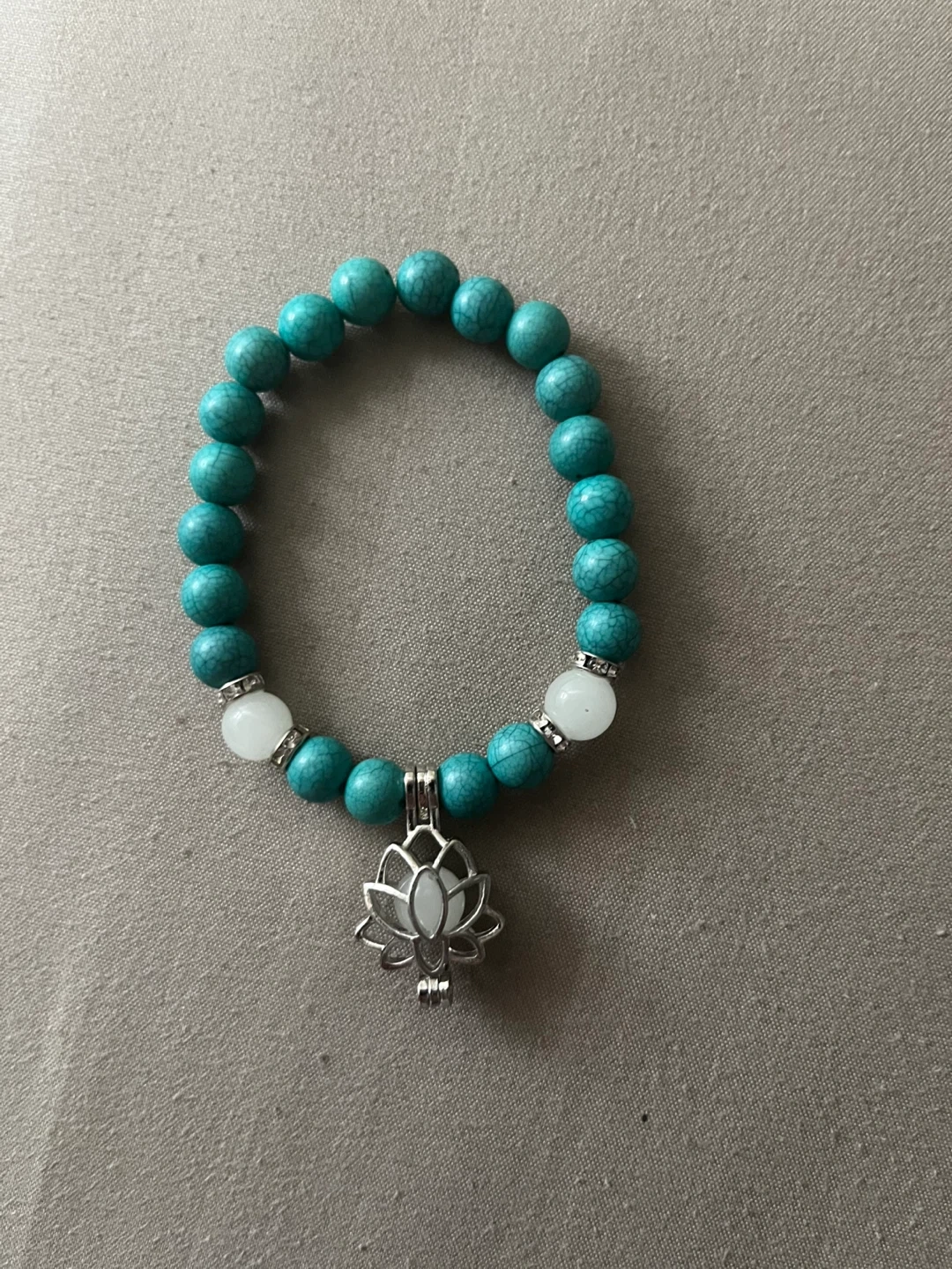 A lovely turquoise beaded bracelet featuring a delicate lotus flower charm. The beads are a beautiful shade of turquoise, accented with white beads that glow in the dark!