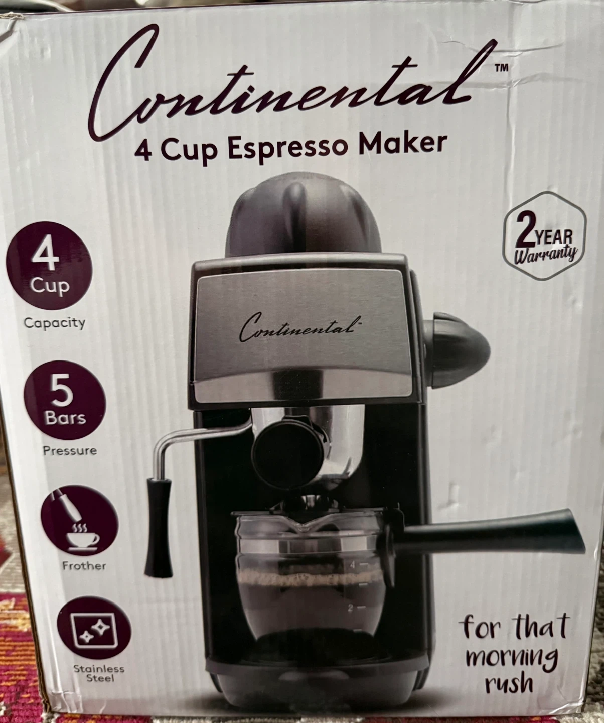 Selling a Continental 4 Cup Espresso Maker! It features a 4-cup capacity and 5 bars of pressure for that perfect morning rush. The espresso maker also has a frother, a stainless steel filter, a powerful steamer, a glass carafe, and a removable drip tray. It also has a 2 year warranty! Box is included