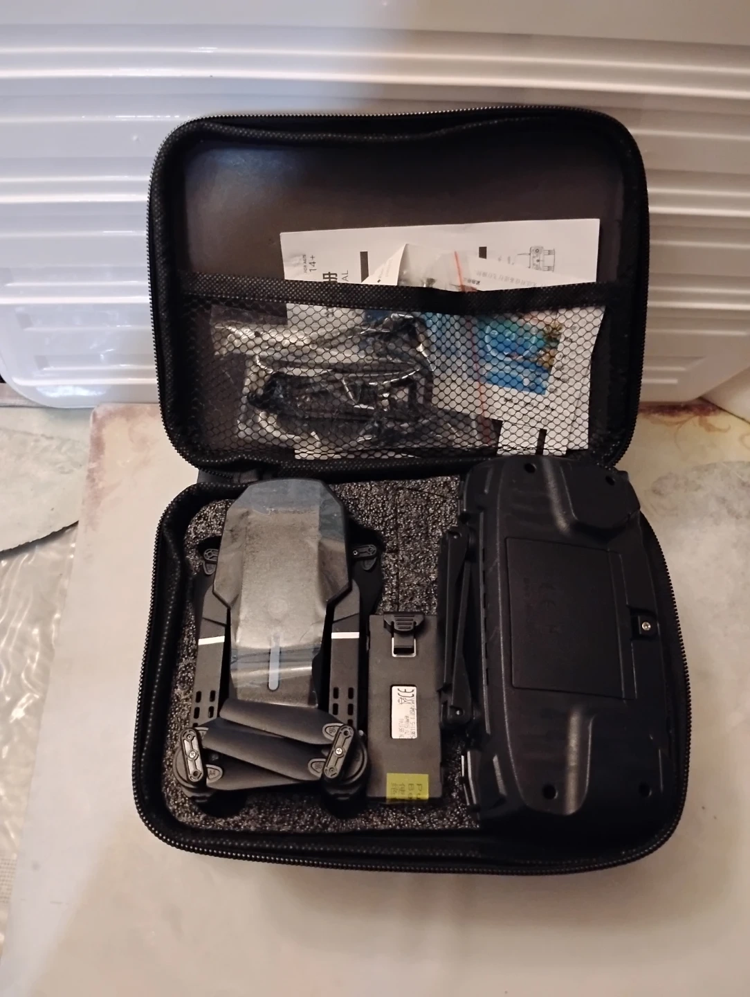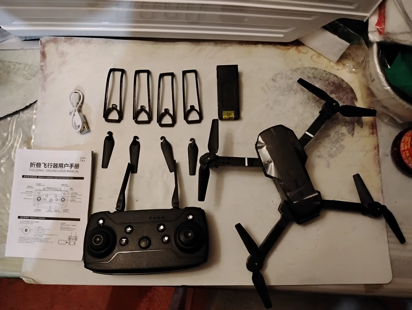 For sale, one black KY UFO E88 Pro Drone brand new in box never before used. Made of ABS material, this drone is light weight and has a maximum take off weight of 98 (g). It has a top flight altitude of 30 meters ( 98.425 ft.), a maximum signal control distance of 80 meters (262.47 ft.), and a optimal horizontal speed of 3 m/s. (meters/second). This item is equipped with dual cameras (fixed camera mount), and has a full assemblance of spare parts, including USB cable.