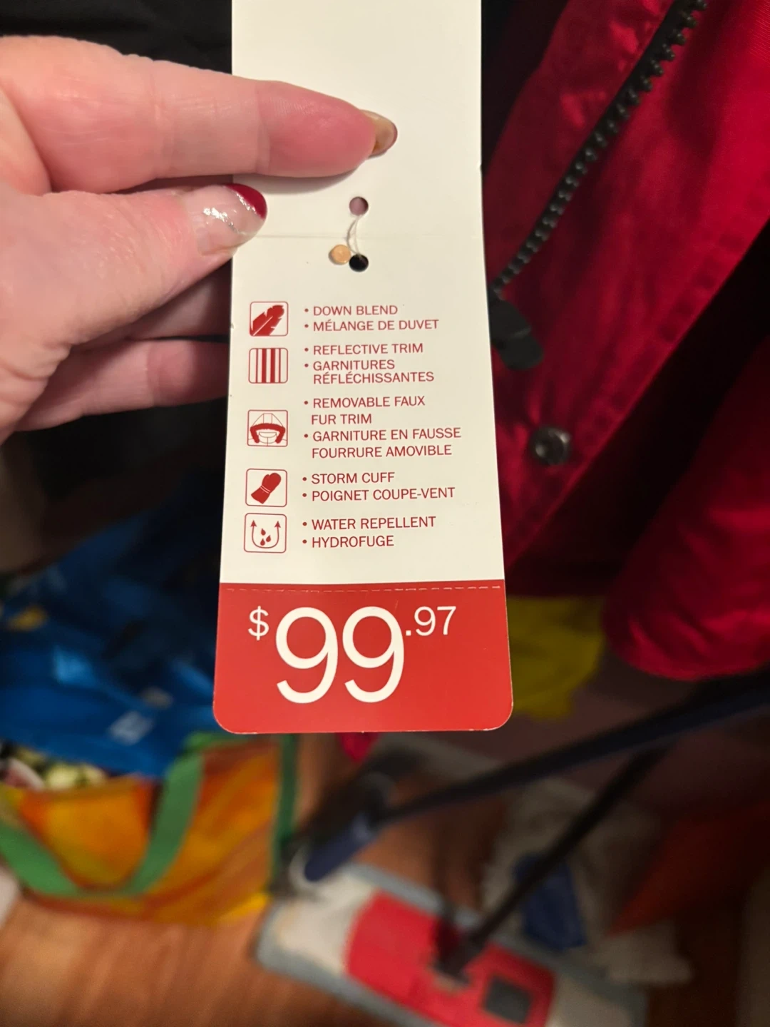 Stay warm this winter with this Canadiana winter jacket! It's rated to -30°C, perfect for those cold Canadian days. It features a down blend, reflective trim, removable faux fur trim, and a storm cuff. Originally priced at $99.97
