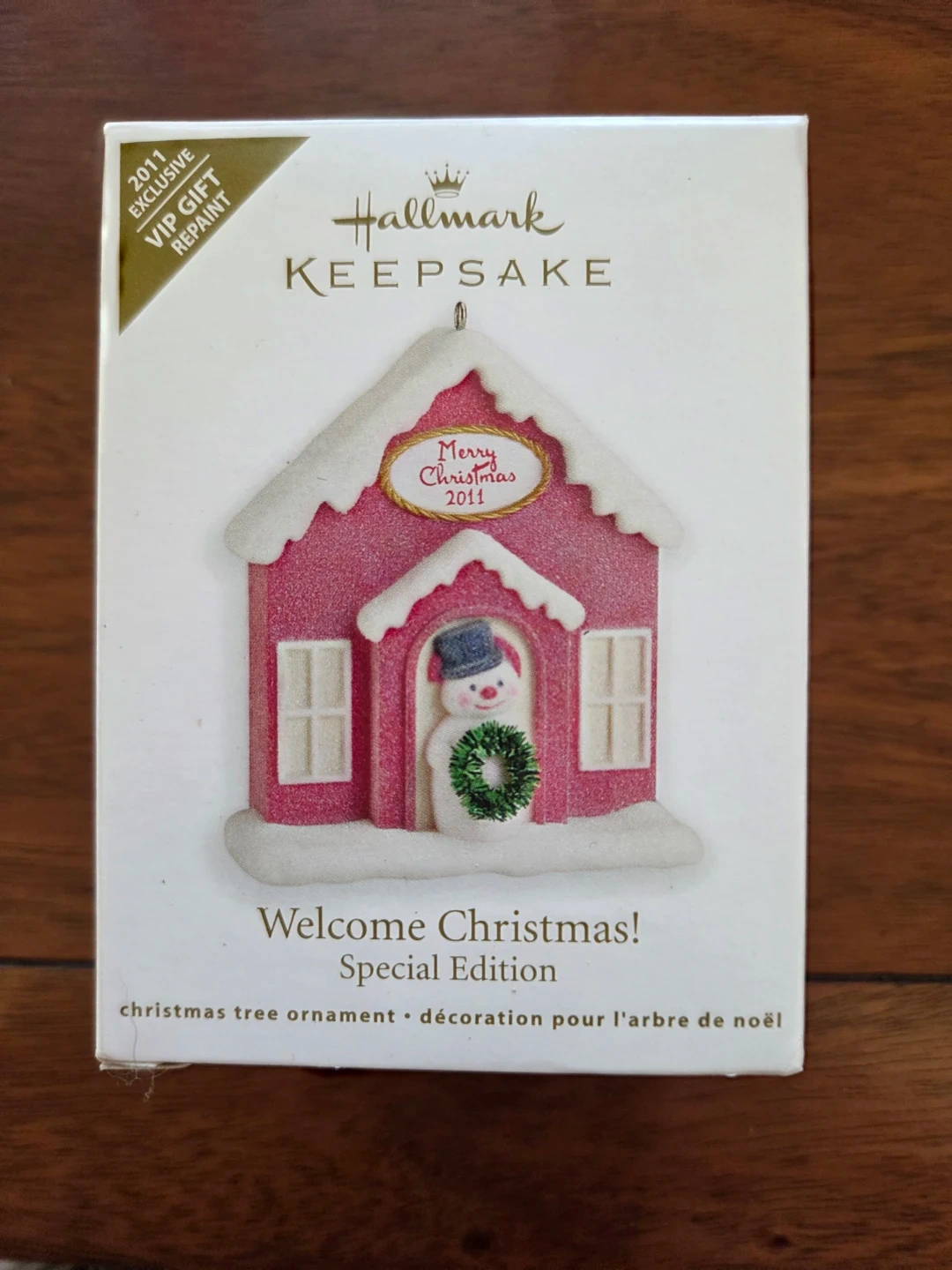 Hallmark Keepsake "Welcome Christmas!" Special Edition ornament. It's a cute pink house with a snowman. Handcrafted and dated 2011. The box is included!
