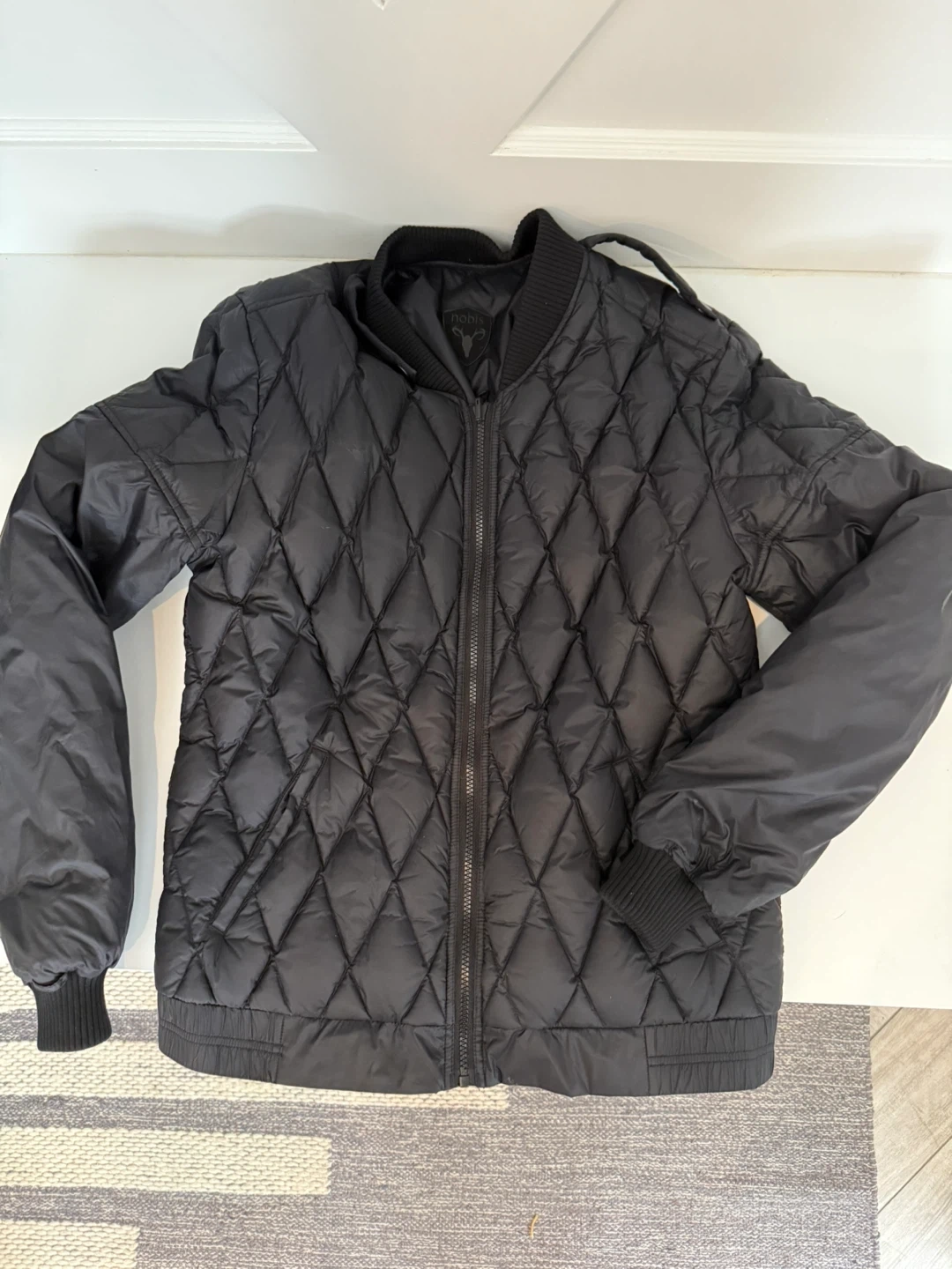 Selling a Nobis black bomber jacket. It's in NEW paid $699 and ready for the cooler weather. It's a stylish and practical choice for everyday wear!