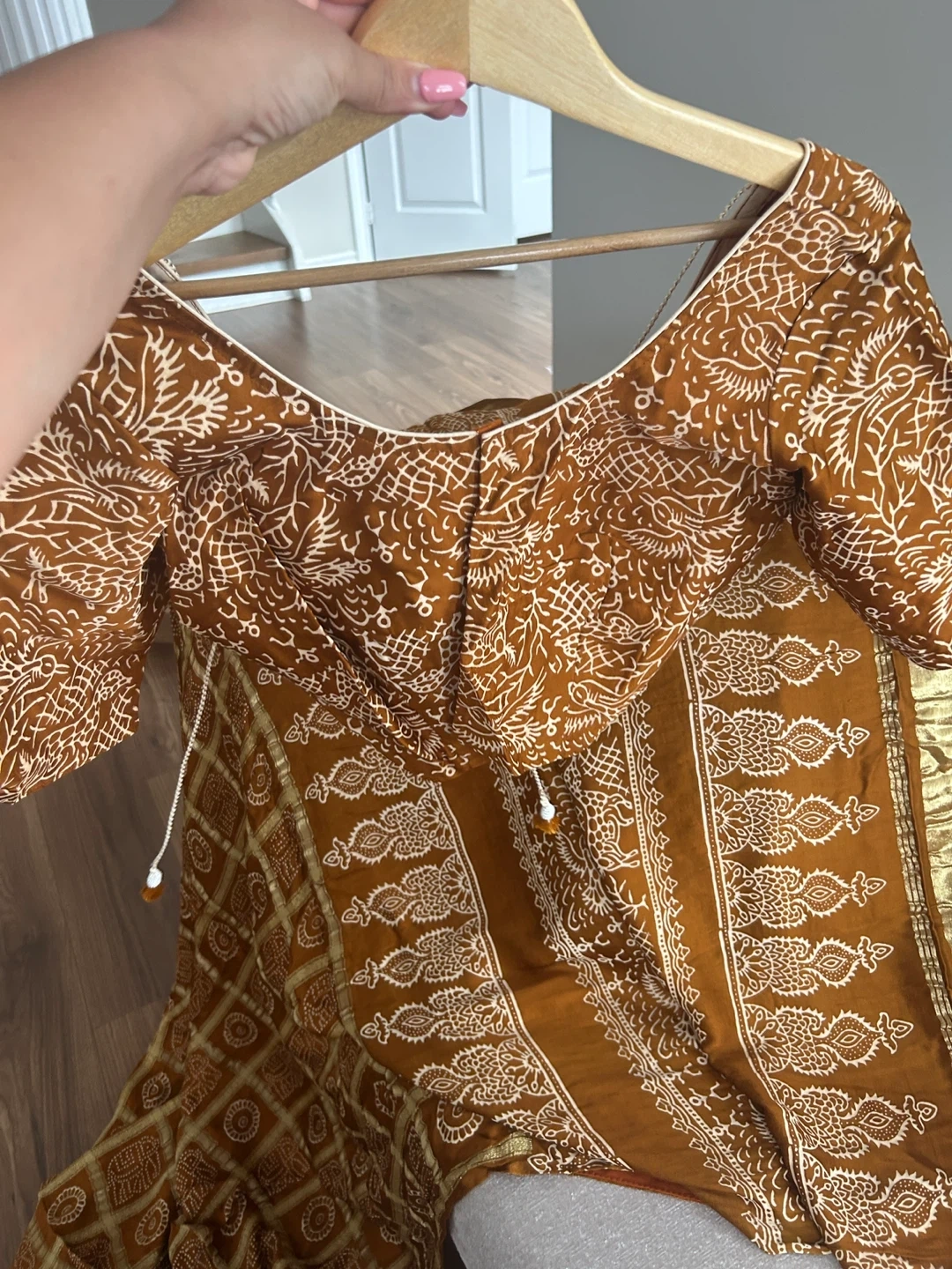 Here's a beautiful brown sari with a matching blouse, perfect for a special occasion or cultural event! The fabric features an intricate pattern in gold and white. It's in great condition and ready to wear!
