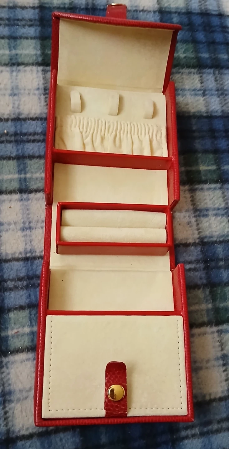 Selling a red travel jewelry case. It's perfect for keeping your jewelry safe and organized on the go. It has compartments for rings, necklaces, and other small items. It's in great condition!