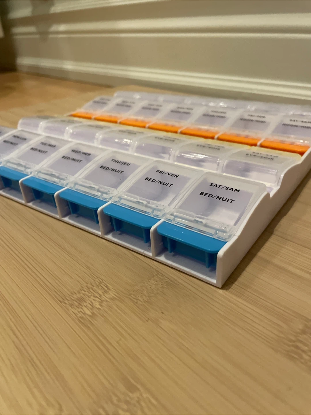 I'm selling a pill organizer that helps you keep track of your medication schedule! It's designed for weekly use, with compartments for four times a day: morning, noon, evening, and bedtime. It's in great condition and ready to help you stay organized