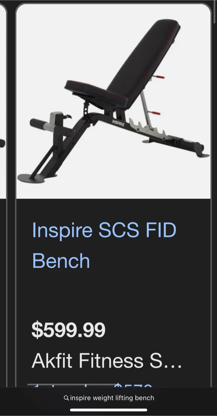 Selling an Inspire SCS FID adjustable weight bench. It's in great condition and ready for a new home gym! The bench is black with red stitching. Originally bought for $599.99
