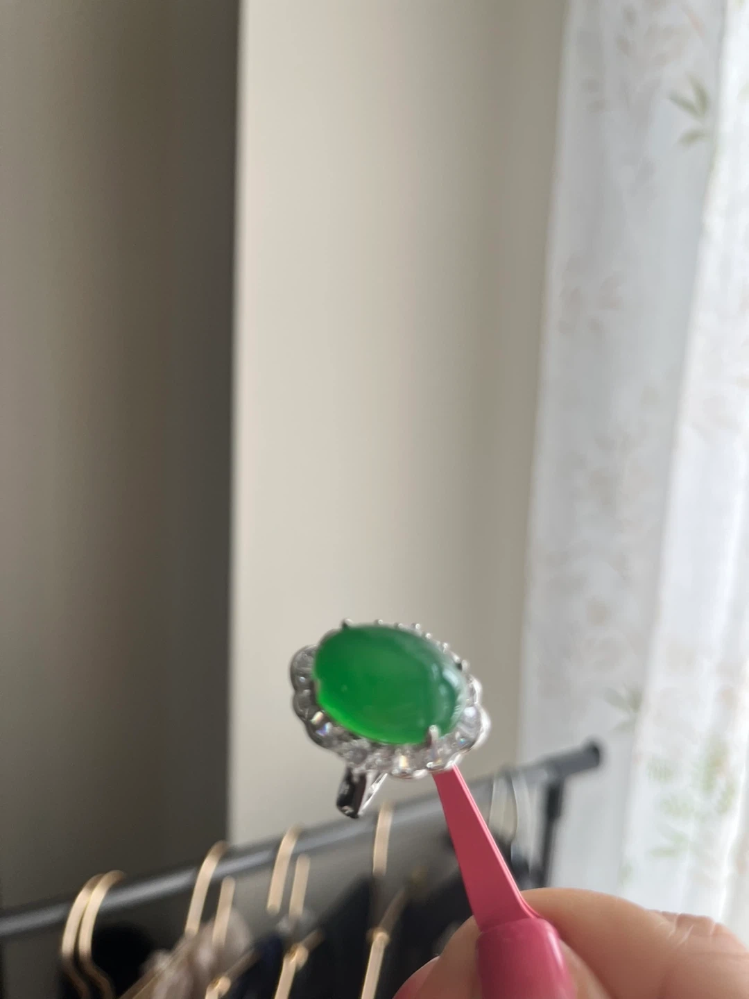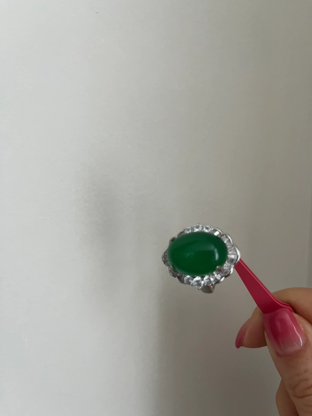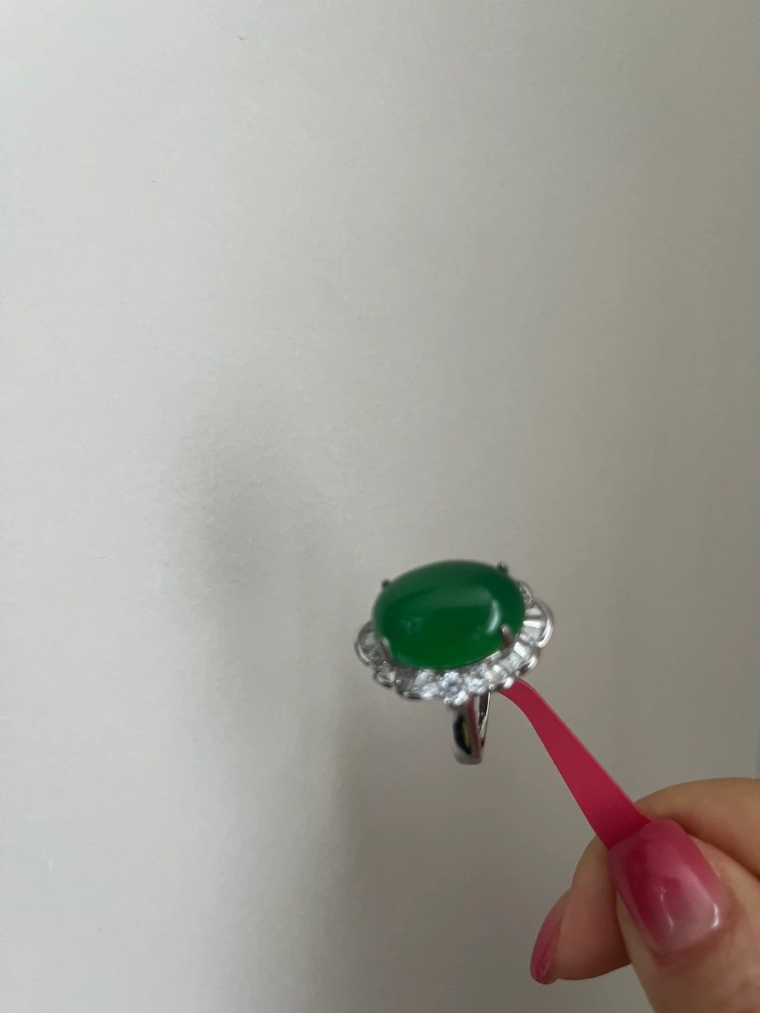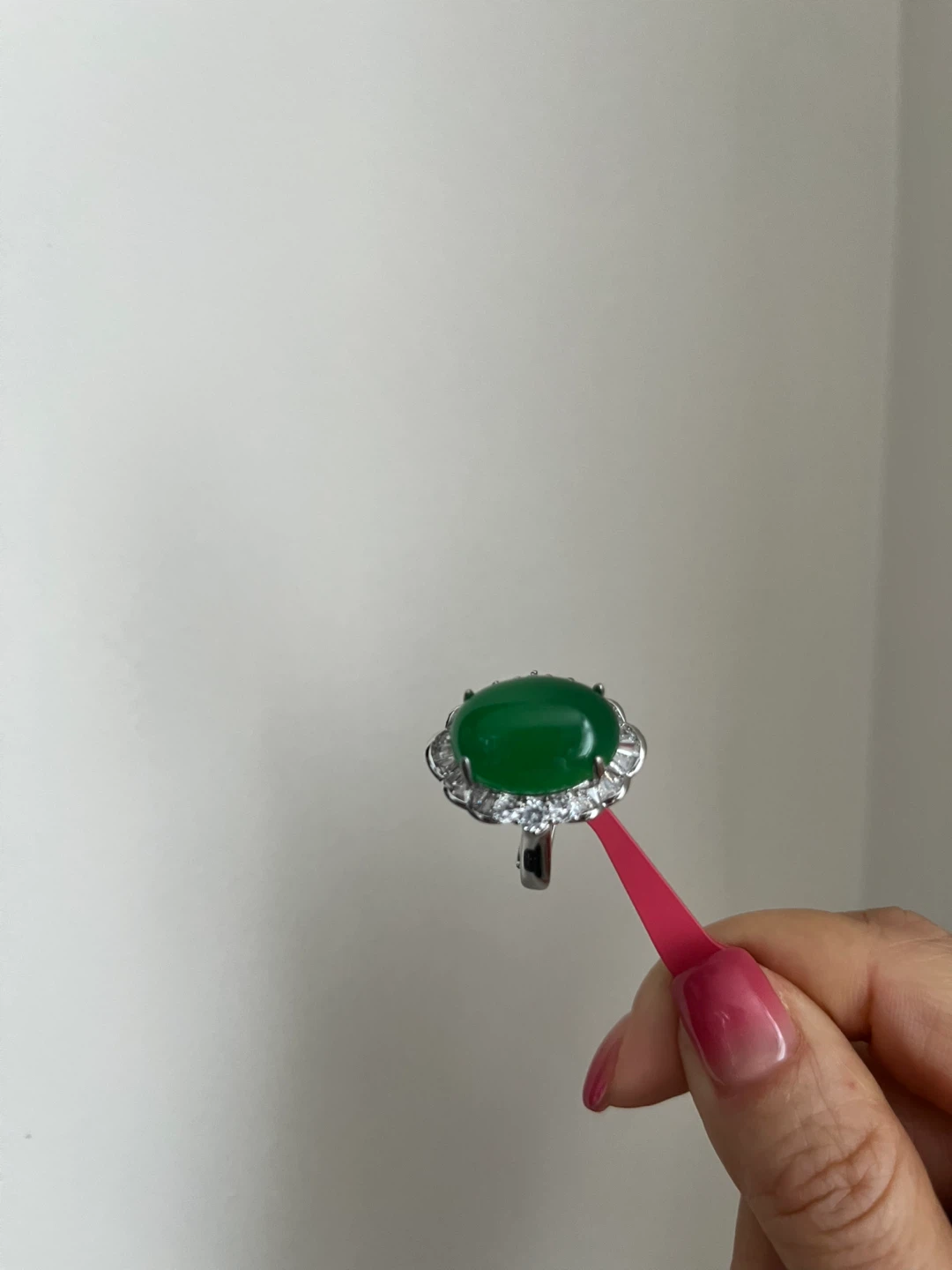 Selling a beautiful green jade ring! It features a lovely green jade stone surrounded by smaller stones. It's in great condition and ready to be worn.