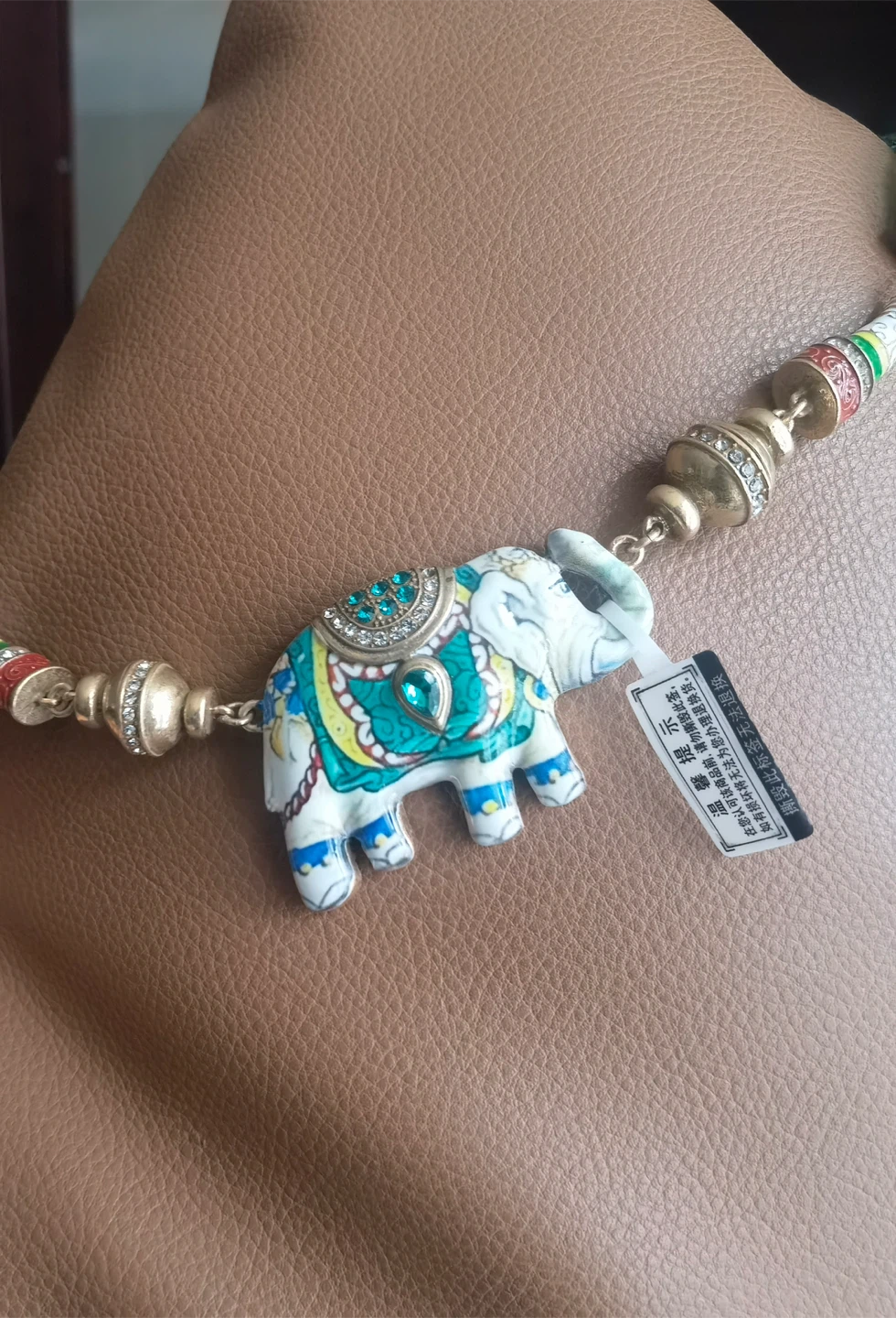 This is a cute elephant pendant necklace. It's got a white enamel elephant with colourful details and some sparkly accents. It's in good condition and ready to add some fun to your outfit!