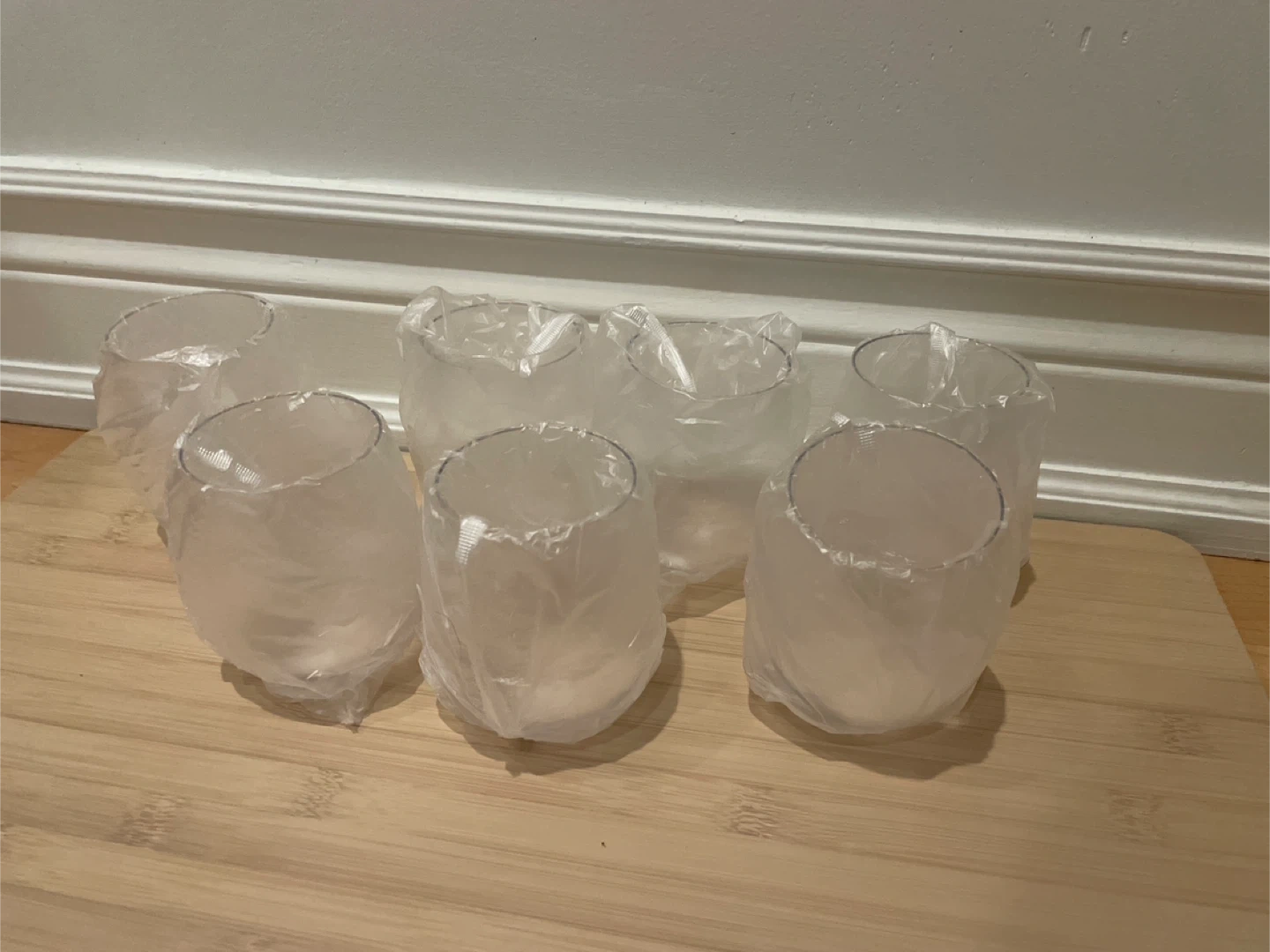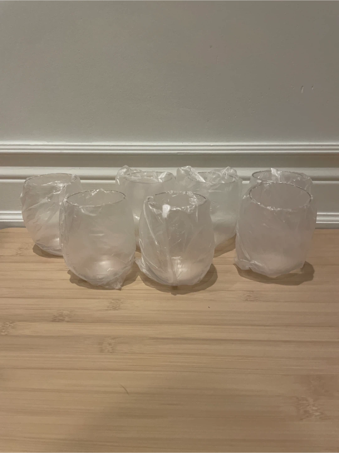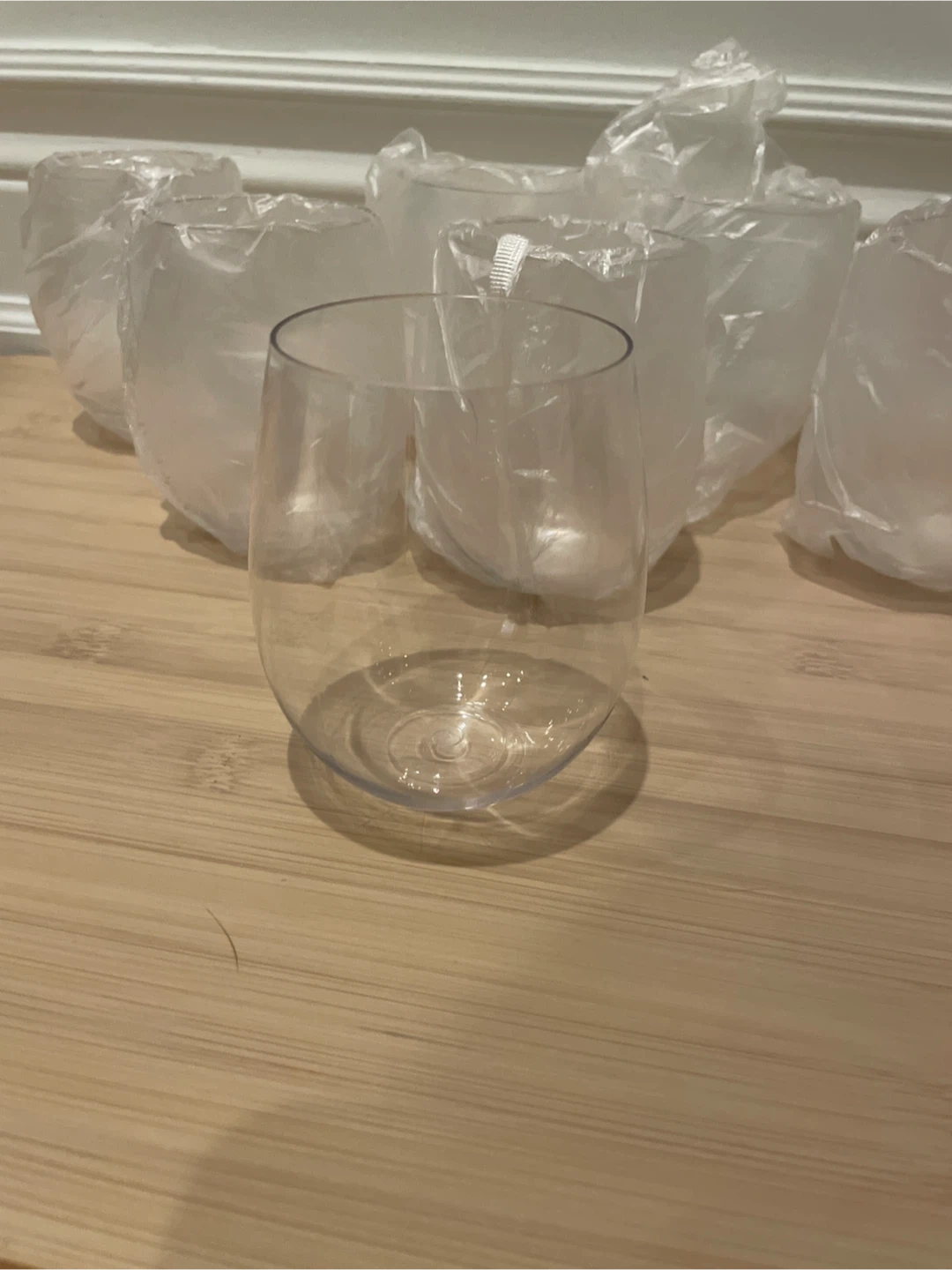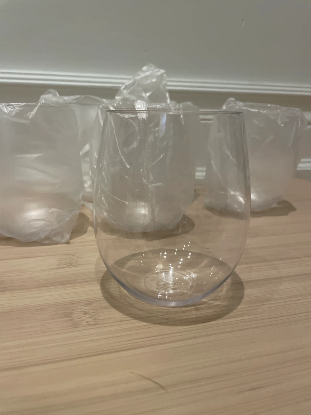 Selling a set of 7 new plastic stemless wine glasses. They are clear and are still in Original packaging!