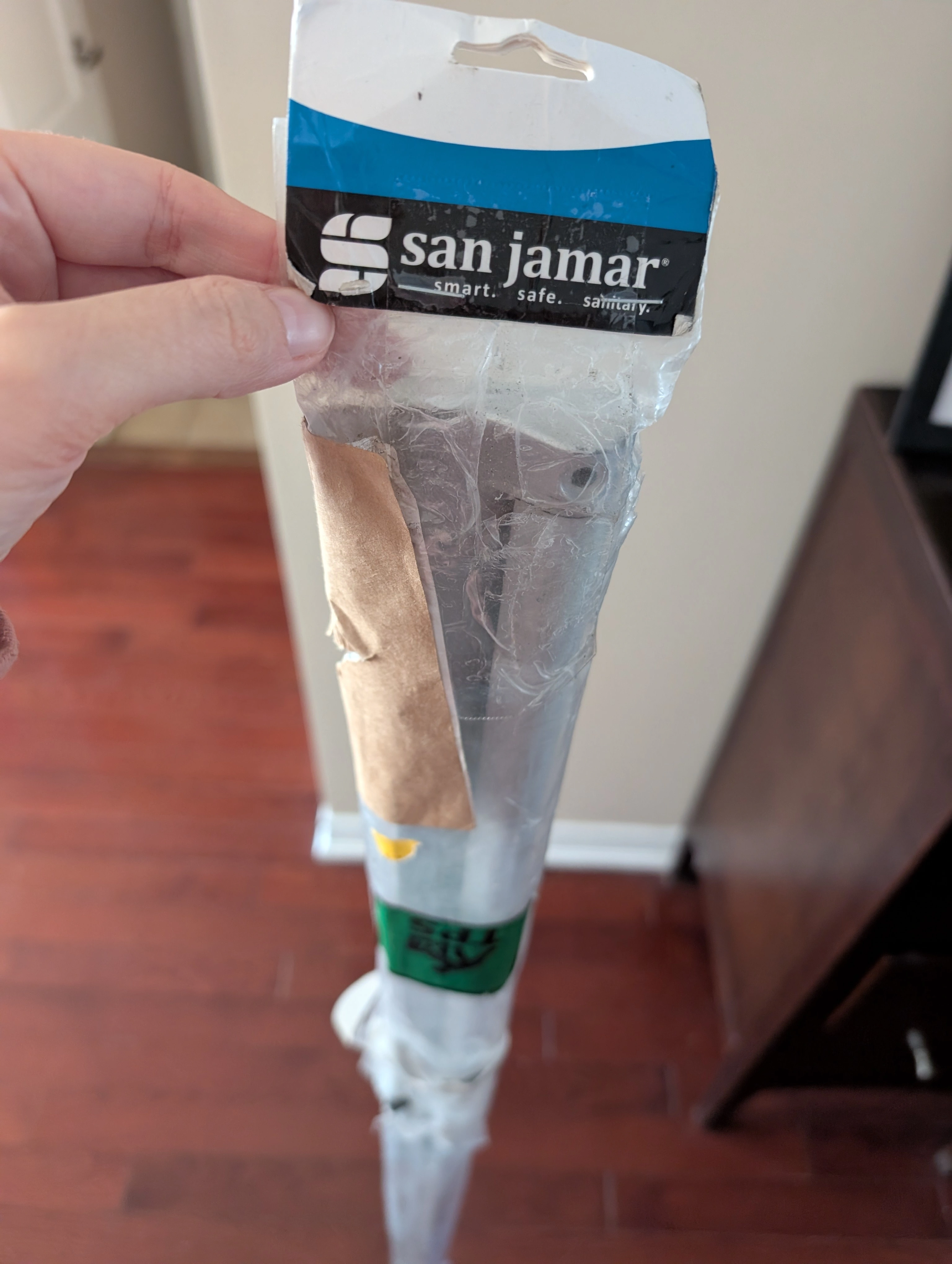 The item is still in the original protective plastic sleeve.