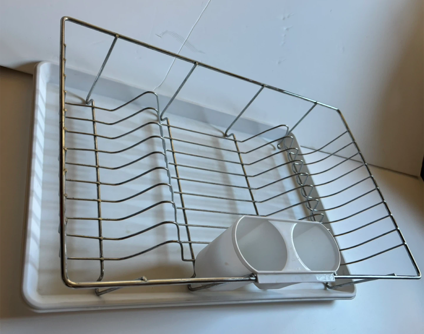This is a white dish drying rack. It has a white tray and a metal rack with a white utensil holder. It's in good condition and ready to help you keep your dishes organized!
