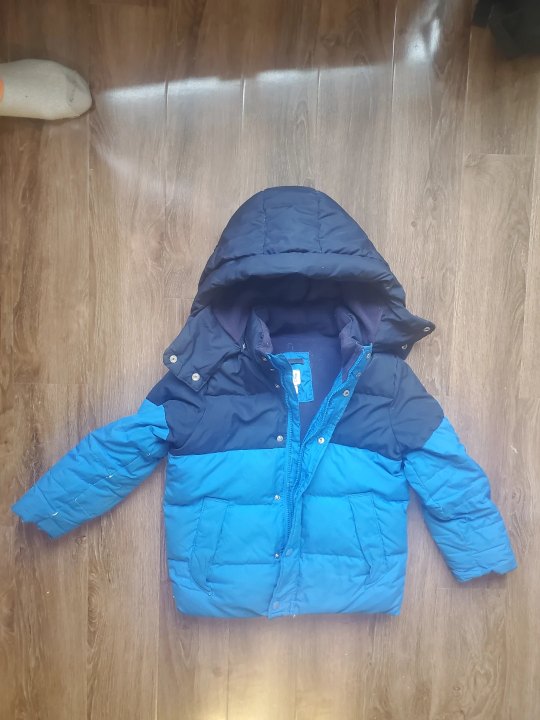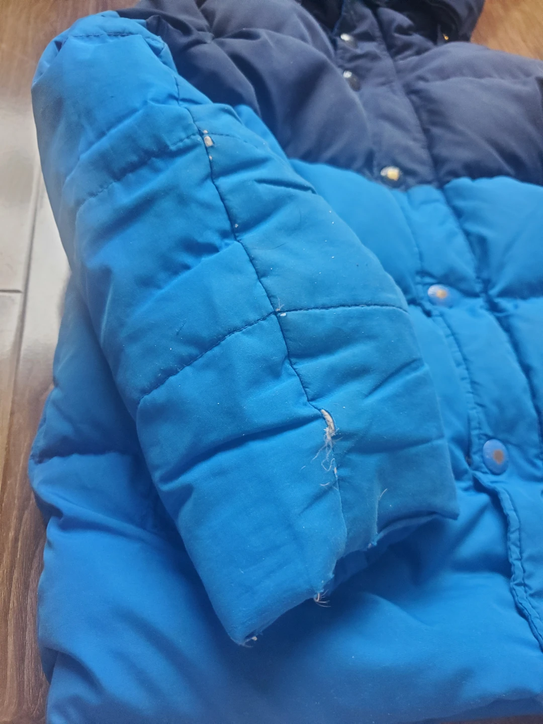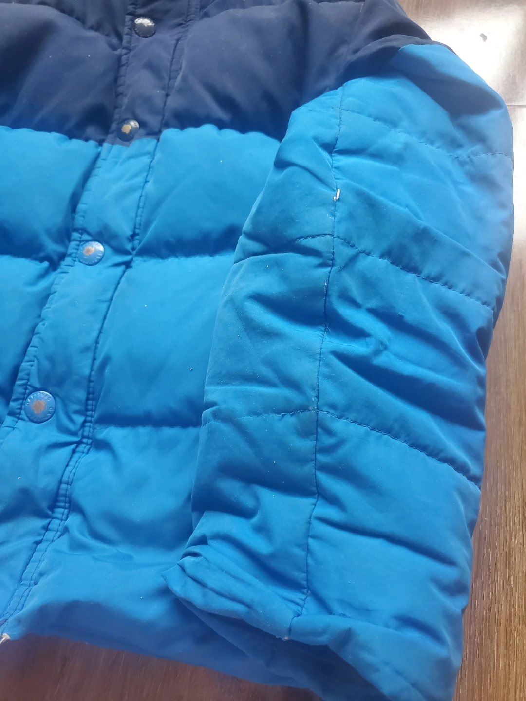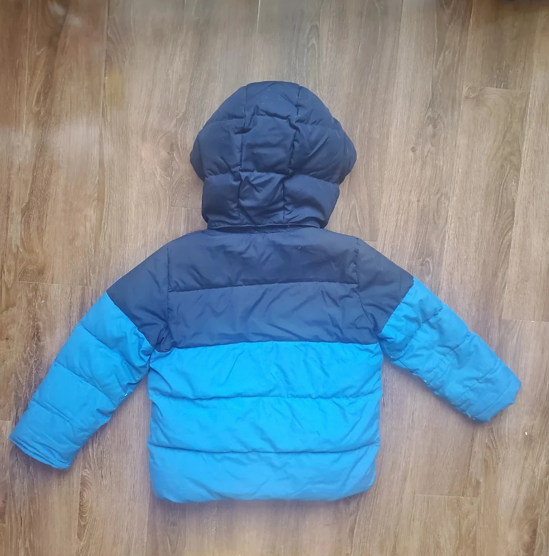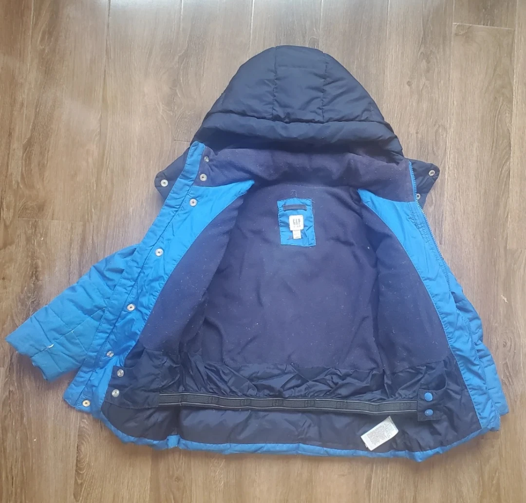 Removable hood. It features a two-tone design with a navy blue upper and a bright blue lower section.