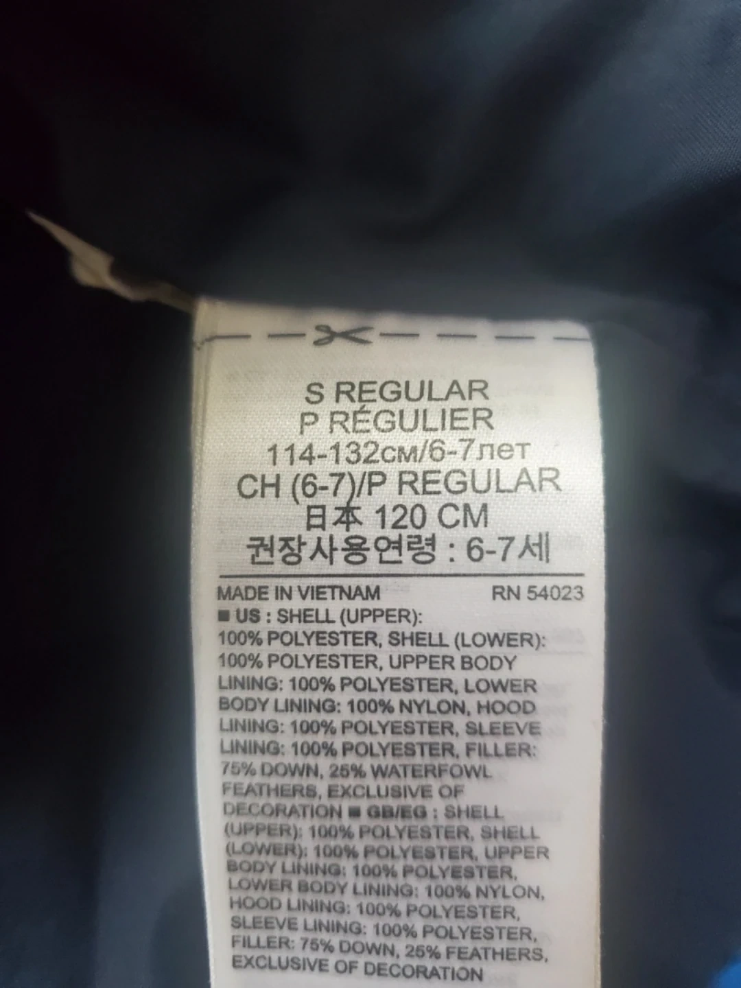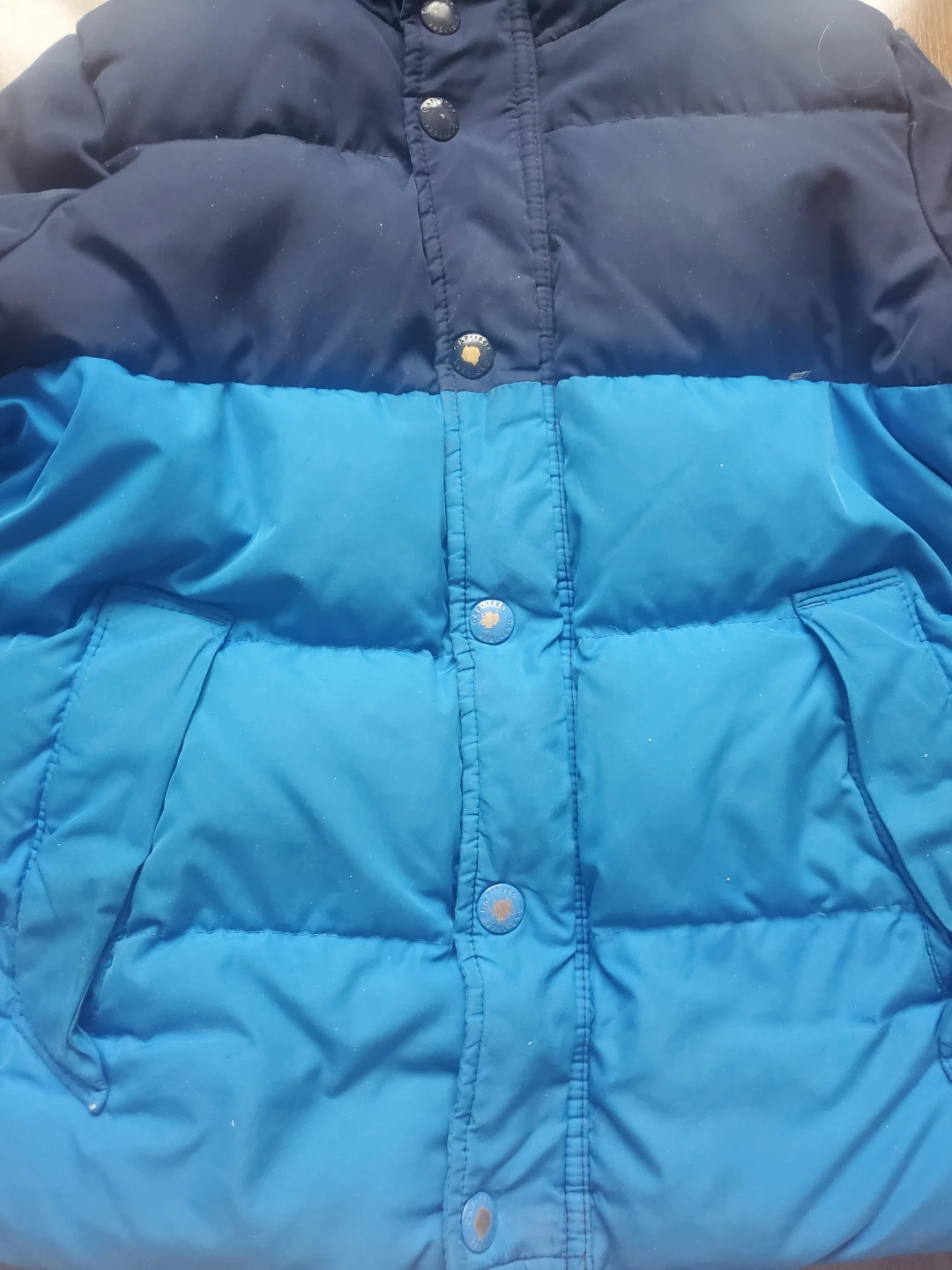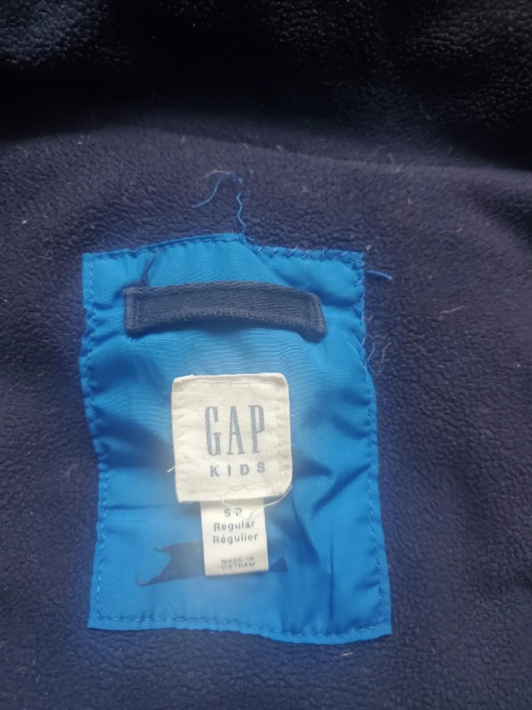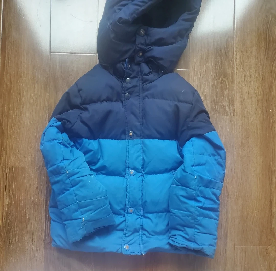 Removable hood. It features a two-tone design with a navy blue upper and a bright blue lower section.