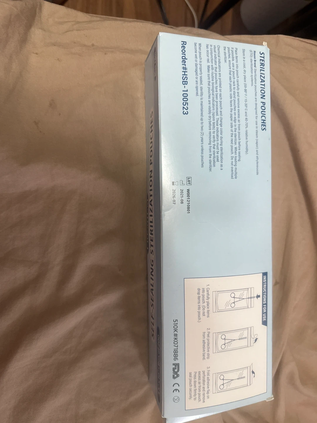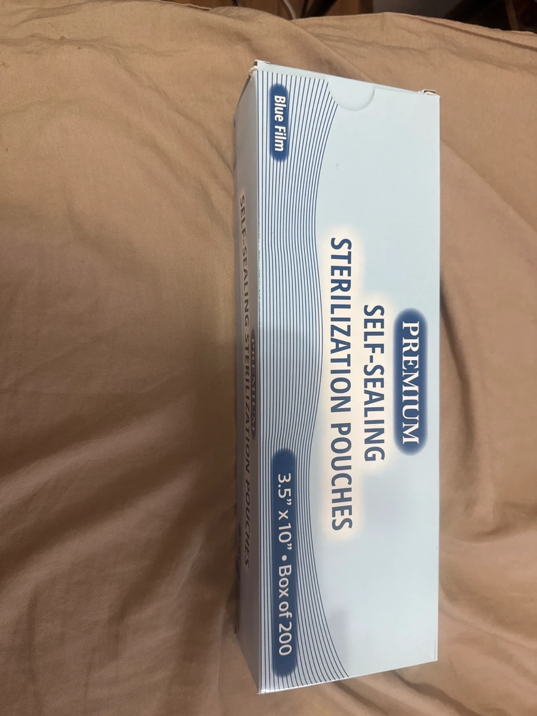 I have a box of Premium self-sealing sterilization pouches for sale. They are 3.5" x 10" and come in a box of 200. The lot number is W007-210801 with a manufacturing date of 2021 July. These pouches are designed to maintain sterility until used ( I have 6 boxes)