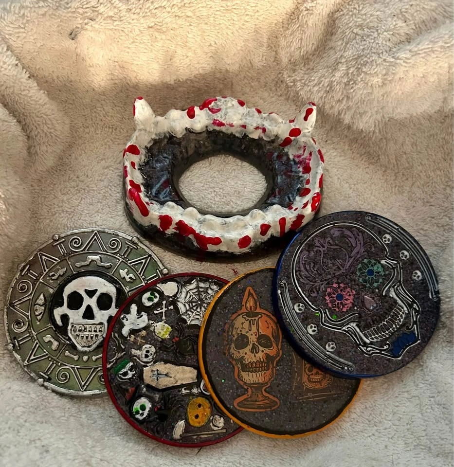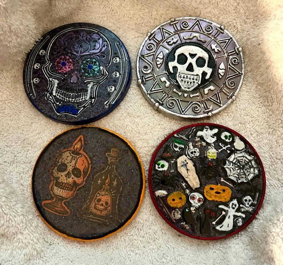 Resin coasters. Can custom make whatever you request. 4 pack for 25. To see more products go to Facebook group MNM’s peculiar designs.