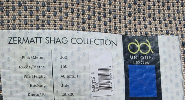 This is a Unique Loom Zermatt shag rug, sized at 8 feet by 10 feet, perfect for adding a cosy touch to any room. As you can see from the photos, this rug is in used but like new condition. Here are some more details: * Pick/Meter: 360 * Reeds/Meter: 160 * Pile Height: 40mm * Backing: Jute * Knots/M Looking to add a bit of warmth to your home? This rug is ready to step up to the task! And hey, if you're seeing this ad, the rug is still waiting for its new home!