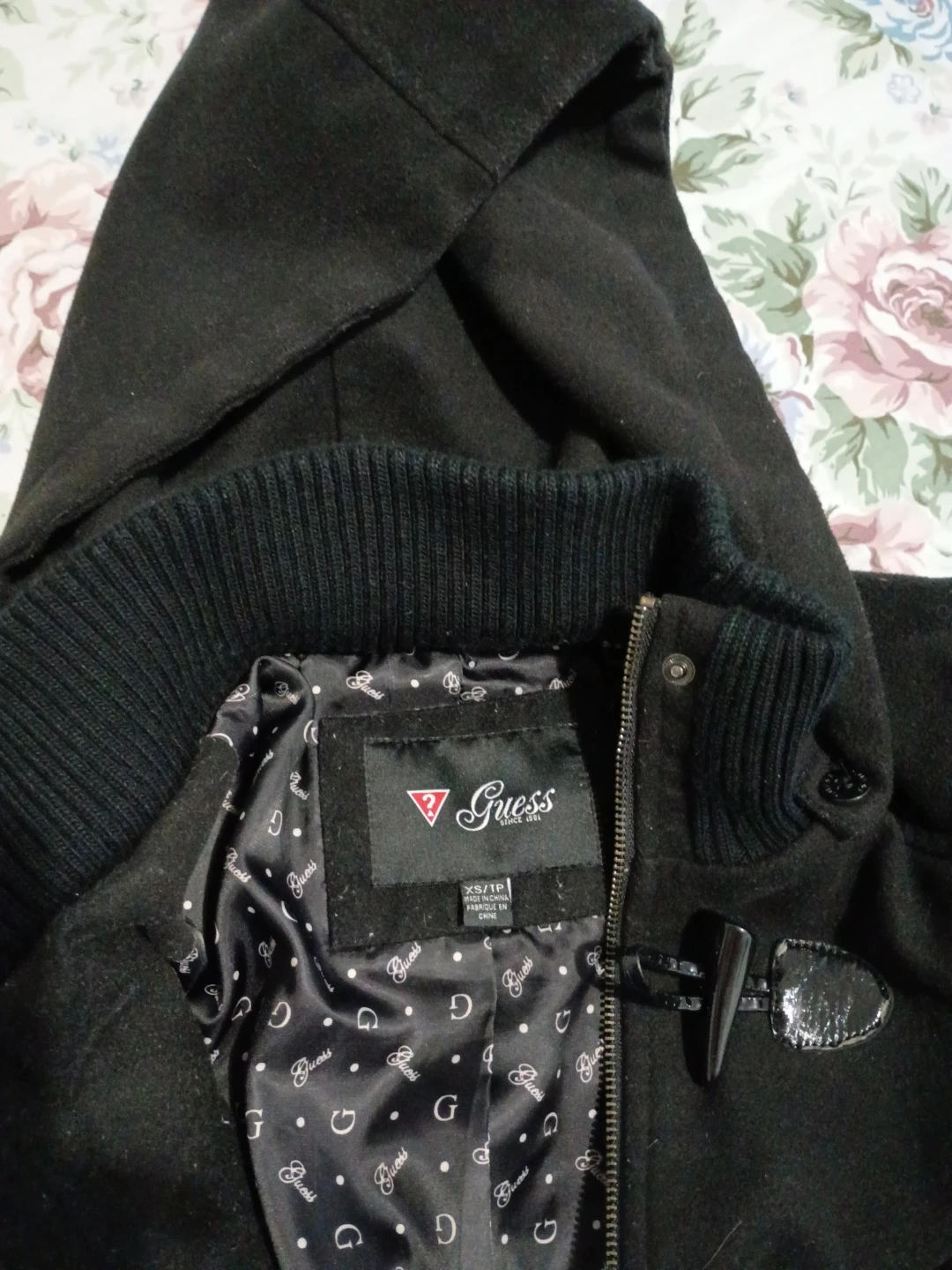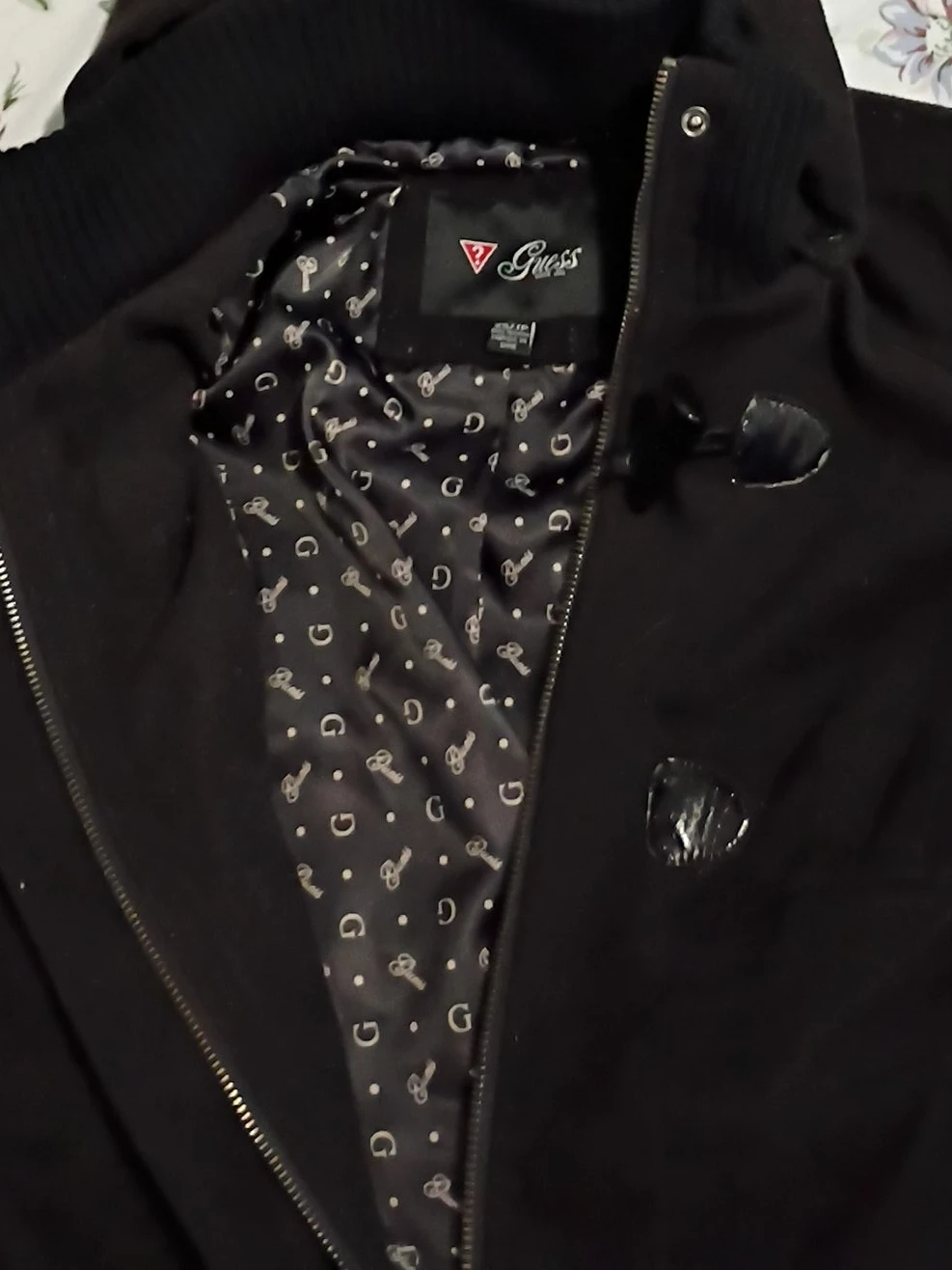 Selling a Guess hooded toggle coat in size XS. It's a stylish black colour and features a unique toggle closure. The lining has a fun 'G' pattern. Perfect for adding a bit of flair to your outerwear collection!