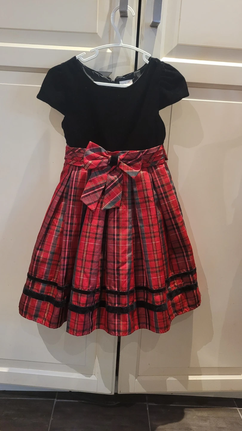This adorable girls' dress features a black velvet bodice and a festive red plaid skirt. It's perfect for holiday parties or special occasions! The dress has a cute bow at the waist and black velvet trim on the skirt.