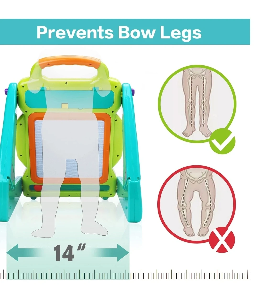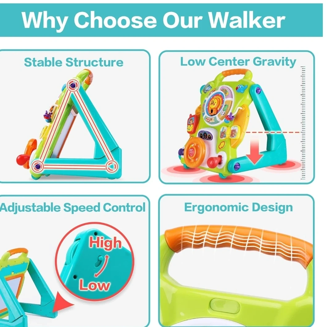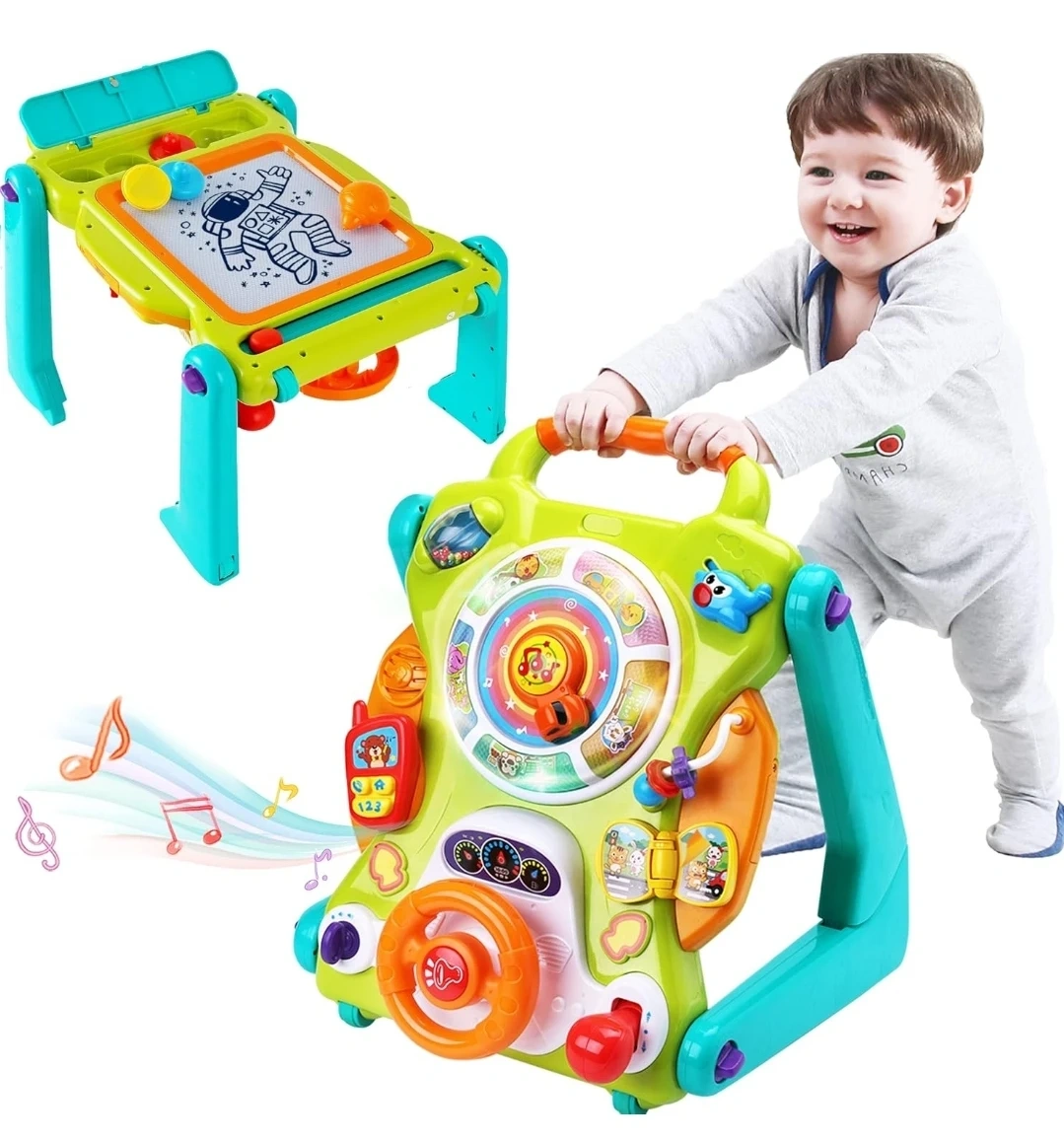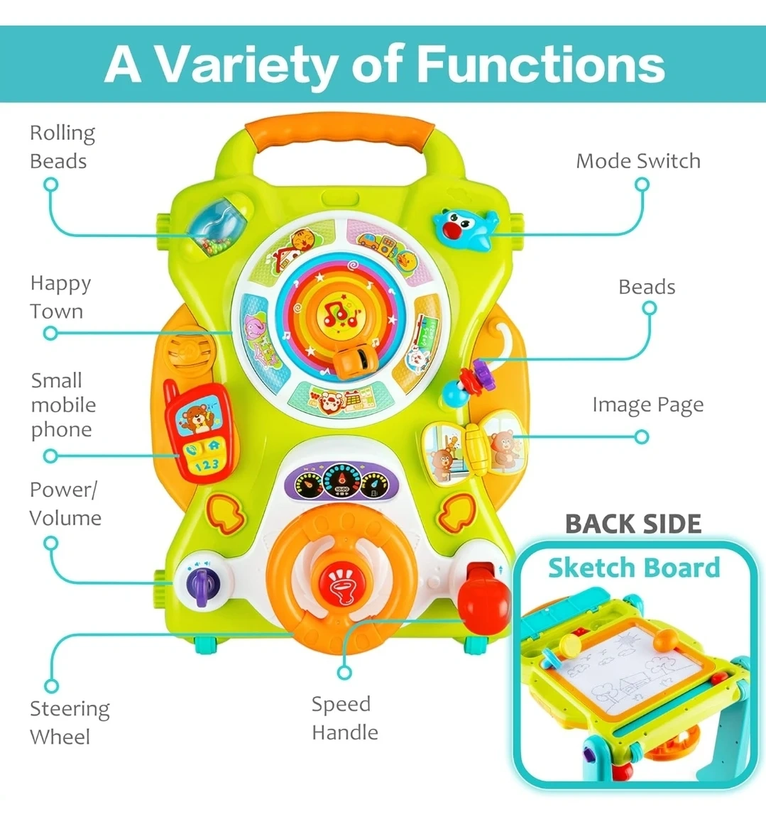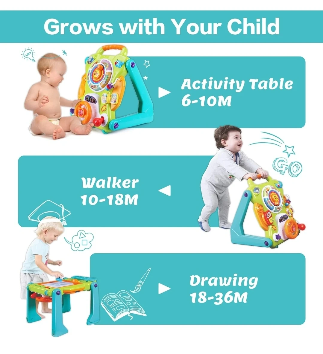 This is a 3-in-1 baby walker activity center table! It can be used as an activity table for 6-10 month olds, a walker for 10-18 month olds, and a drawing table for 18-36 month olds. It has a stable structure, low center of gravity, adjustable speed control, and ergonomic design. It also has a variety of functions, including rolling beads, a happy town, a small mobile phone, power/volume control, a steering wheel, a speed handle, beads, an image page, and a sketch board on the back side