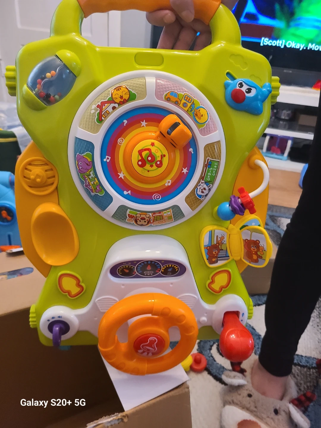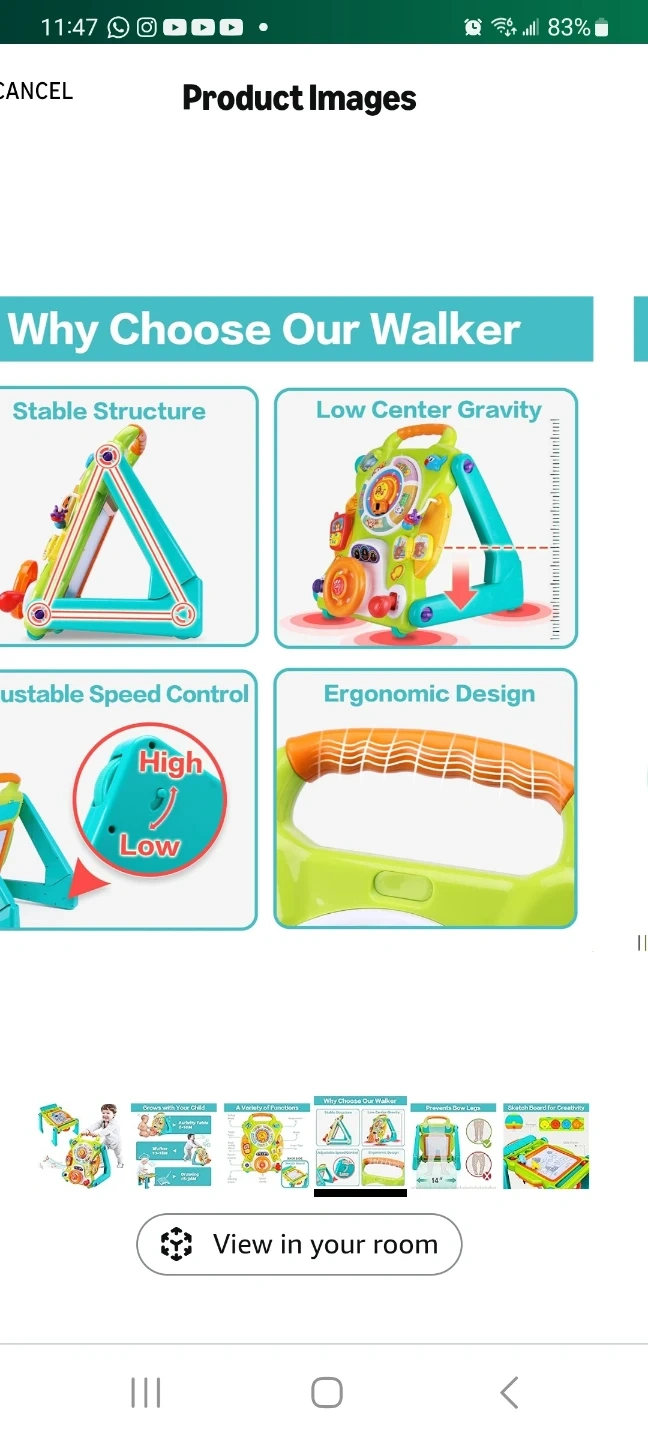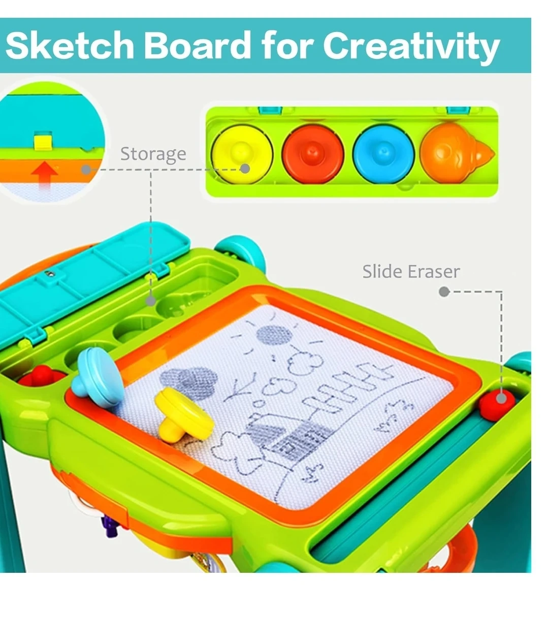 This is a 3-in-1 baby walker activity center table! It can be used as an activity table for 6-10 month olds, a walker for 10-18 month olds, and a drawing table for 18-36 month olds. It has a stable structure, low center of gravity, adjustable speed control, and ergonomic design. It also has a variety of functions, including rolling beads, a happy town, a small mobile phone, power/volume control, a steering wheel, a speed handle, beads, an image page, and a sketch board on the back side