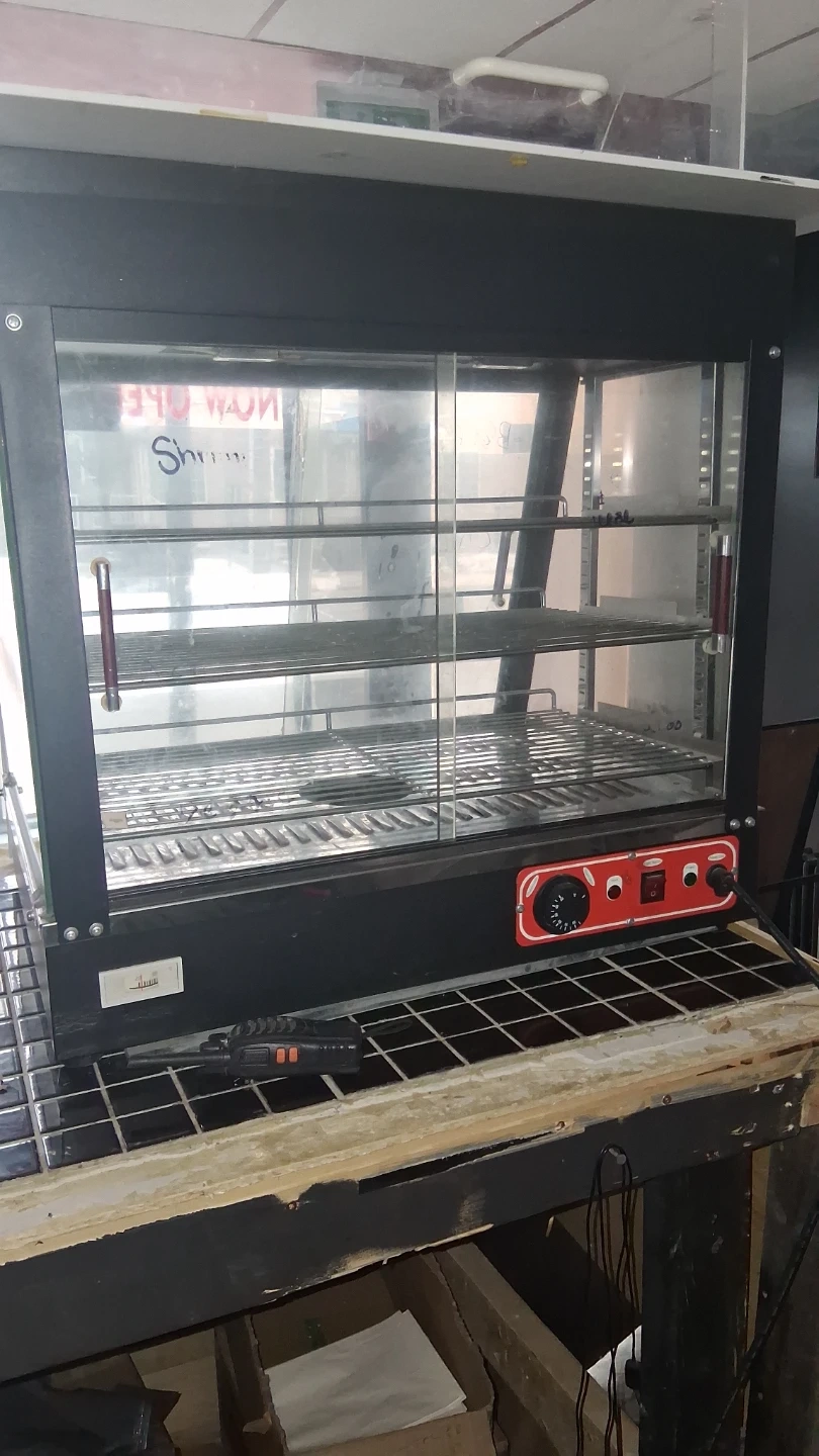 Selling a commercial food warmer display case. It has a black exterior with a glass display. It's in good condition and ready to use for your business!