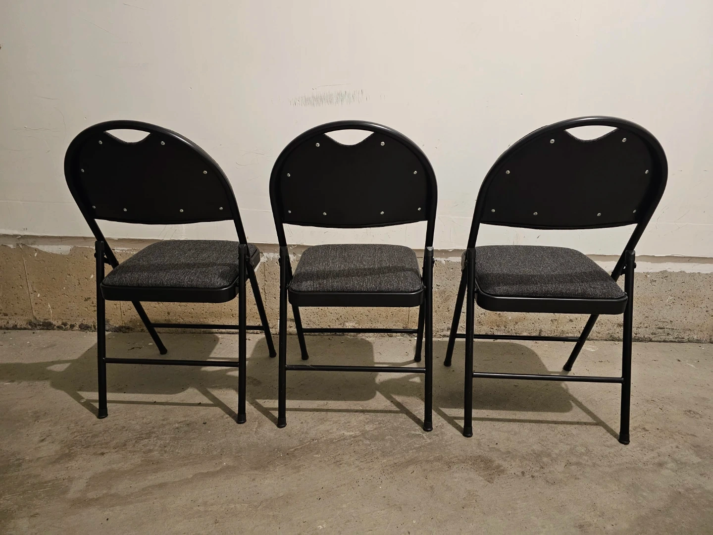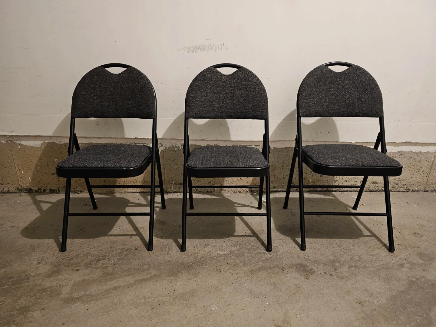 Selling a set of three folding chairs. They're in great shape and perfect for extra seating when you have guests over. The chairs are black with a grey fabric seat and back. Easy to fold up and store away when not in use. $20 each.