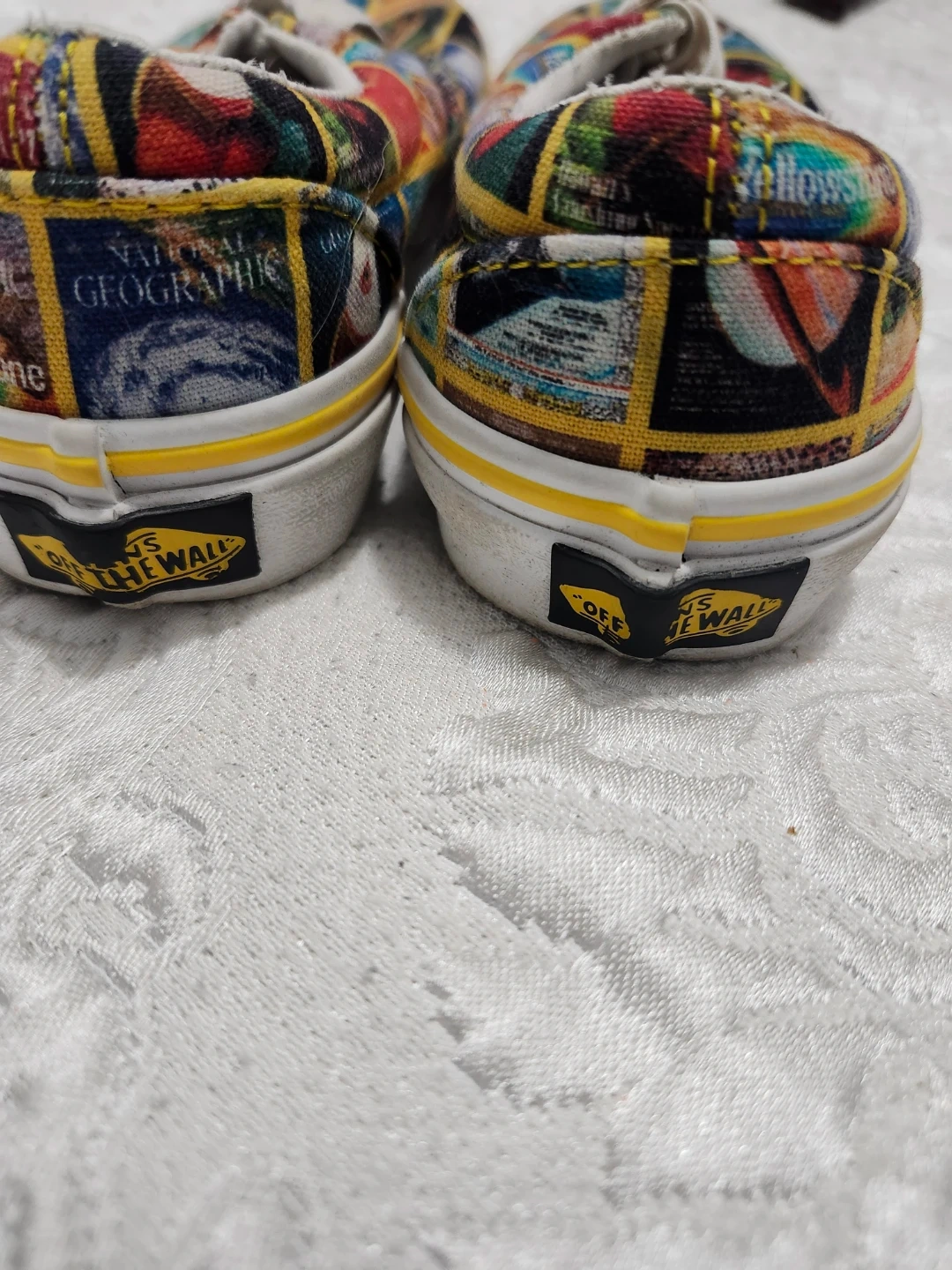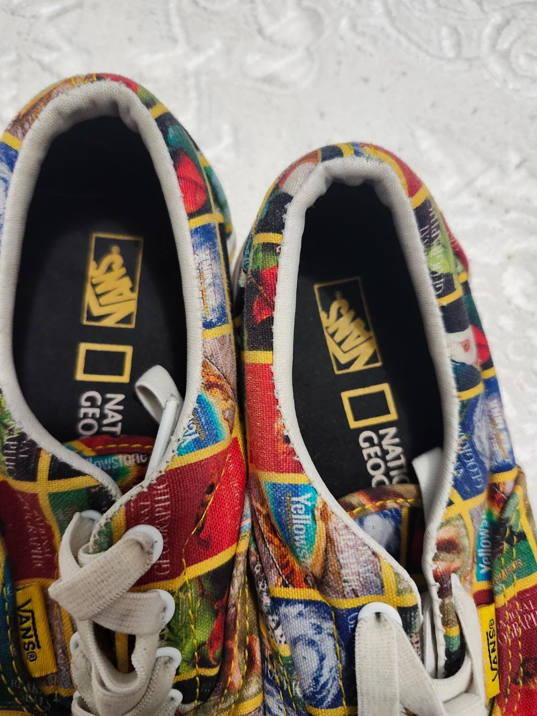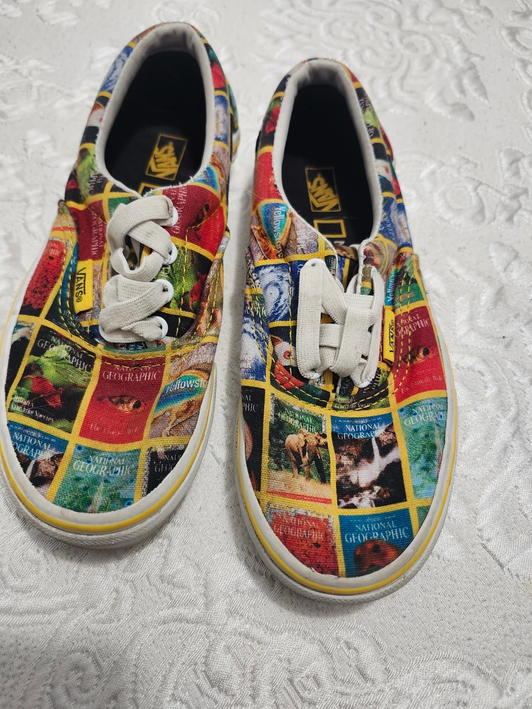 These awesome Vans sneakers feature a colorful National Geographic magazine cover print all over the canvas. They’re in good used condition with lots of life left in them. Comfortable, stylish, and perfect for any kid who loves animals or bright designs.
