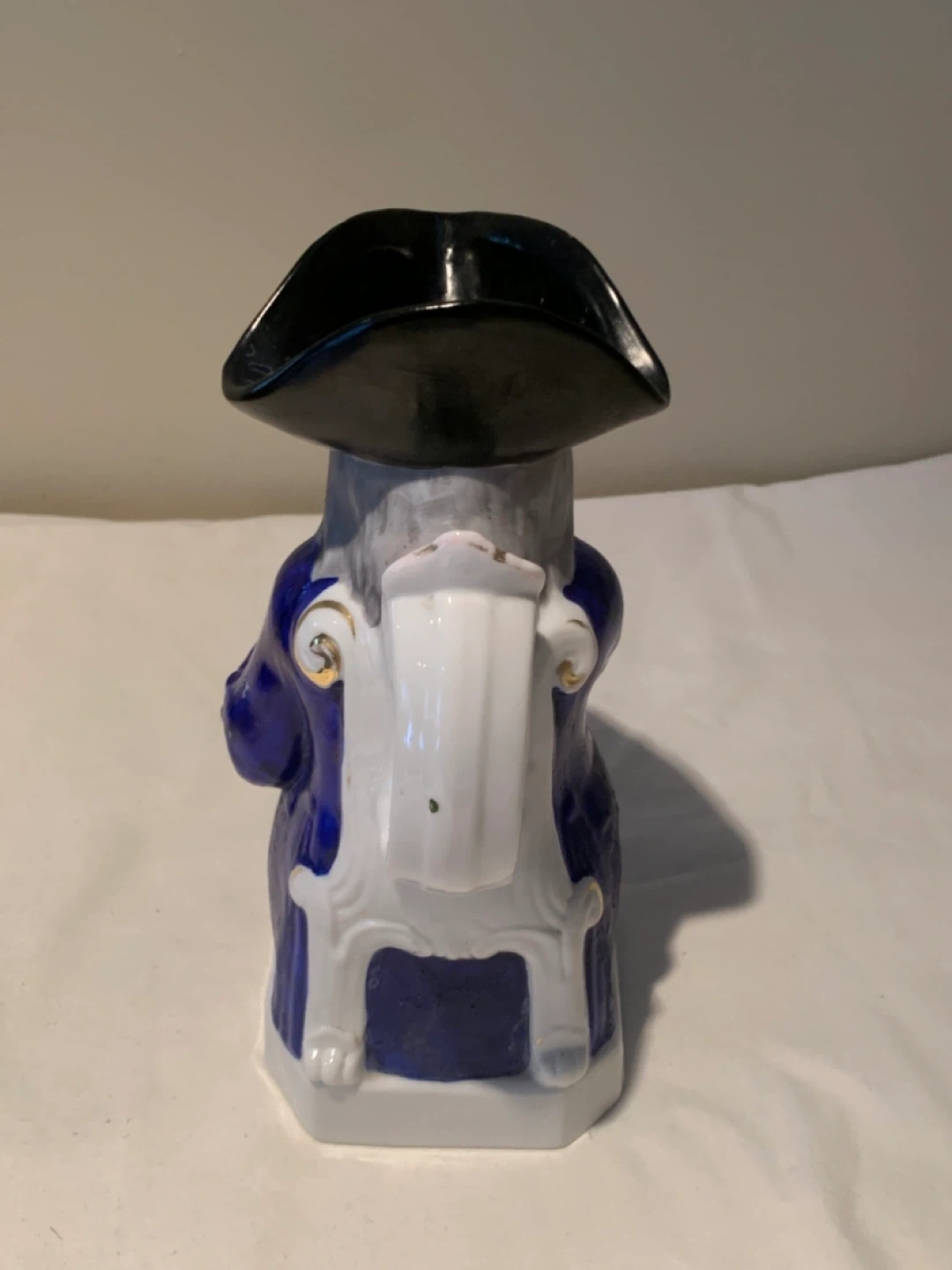 Selling a vintage Toby Jug figurine! It's a charming piece with a traditional design, featuring a seated character in a blue coat and black hat. This unique collectible would make a great addition to any home