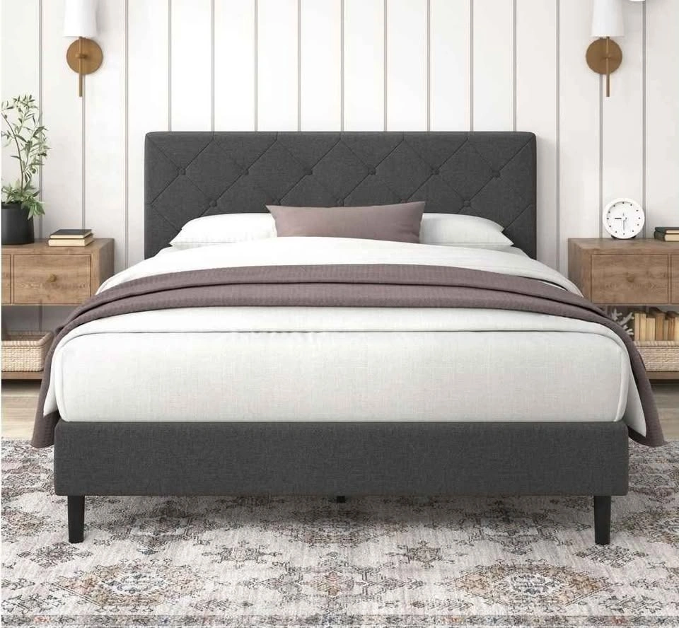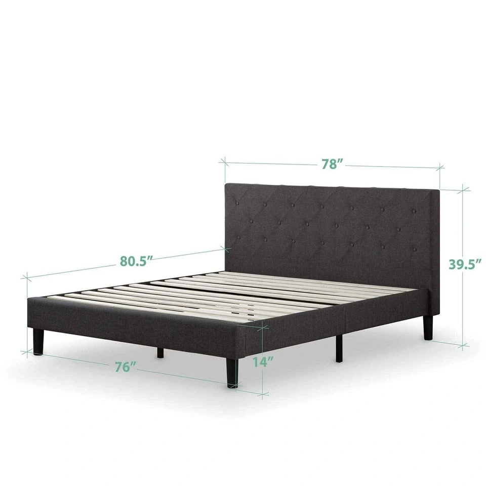 Zinus King Bed Frame - Shalini Upholstered Platform Bed Frame with Full-Sized Headboard - Wood Slat Support, Easy Assembly, No Box Spring Needed, Underbed Storage Space, Dark Grey, King Size, Original box