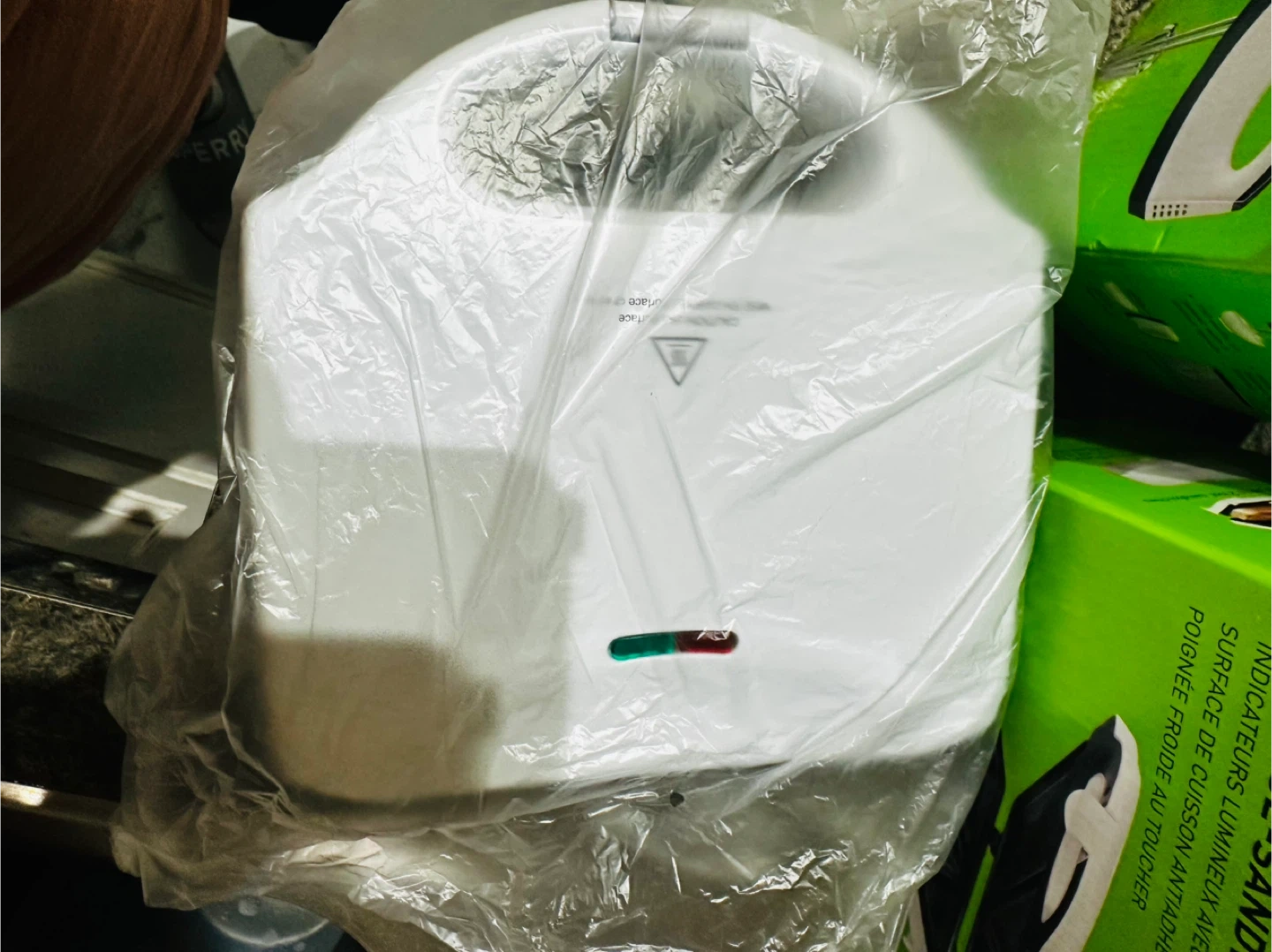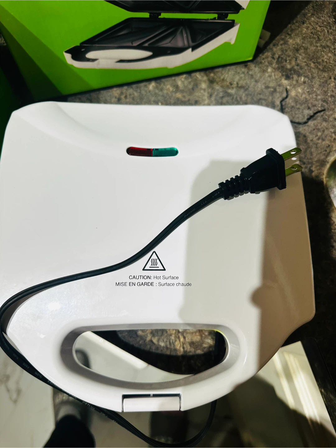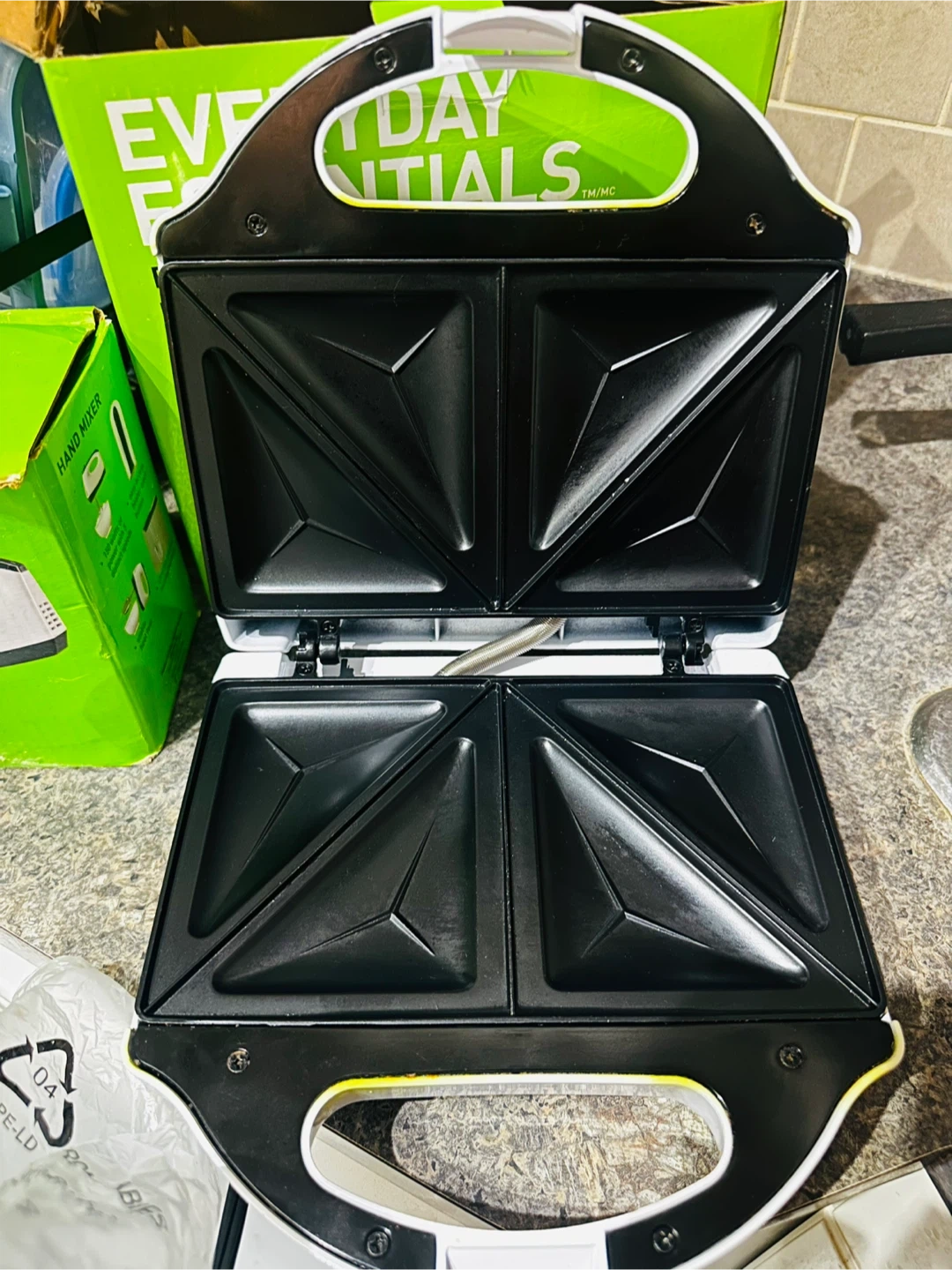 I'm selling a brand new Everyday Essentials sandwich press, still in its original box! It features indicator lights, a non-stick cooking surface, and a cool-touch handle. Ready to make some delicious sandwiches!