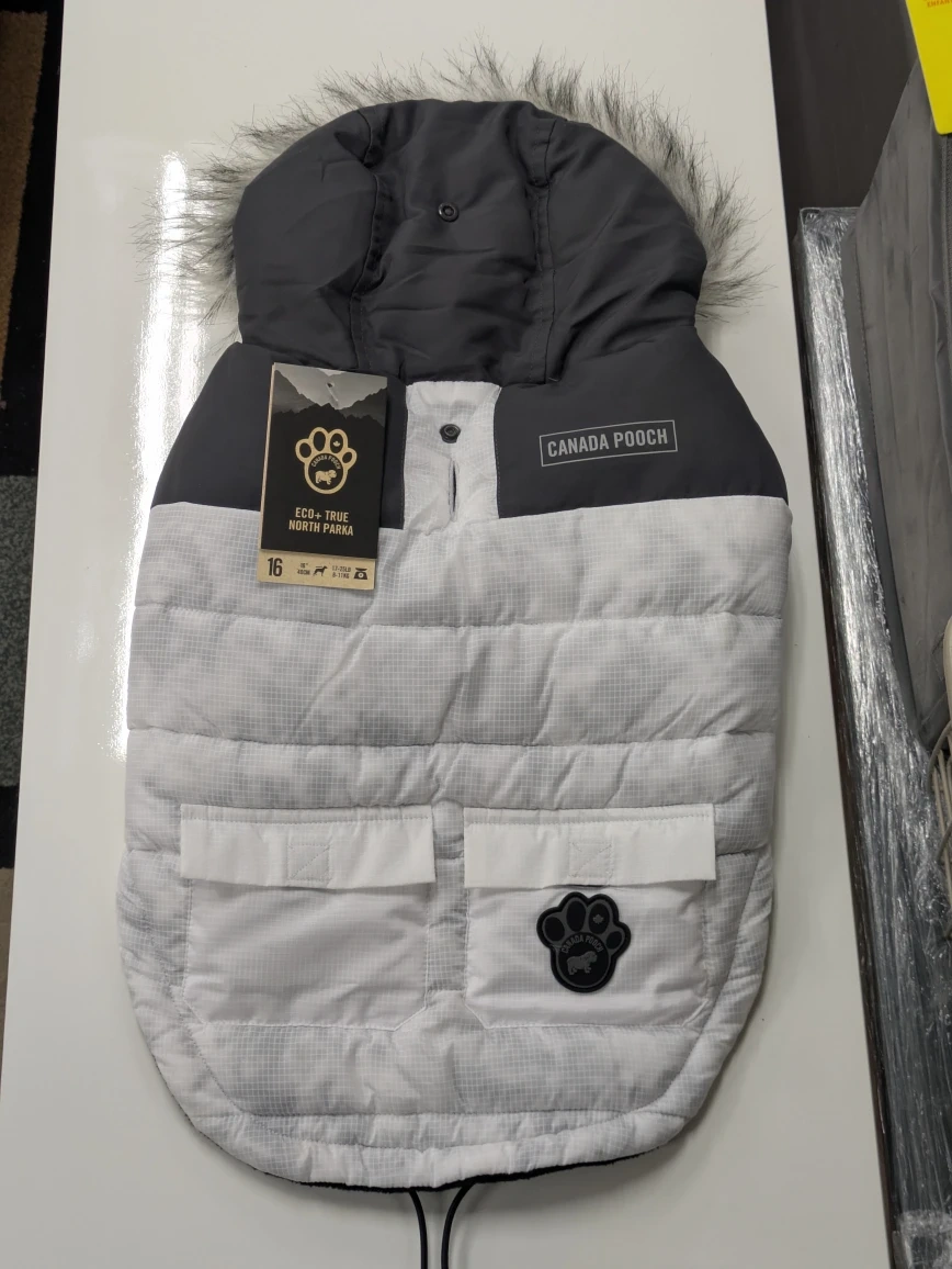 Selling a Canada Pooch Shiny Puffer Vest in size 14! The tag shows it was originally CAD $57.99. Perfect for keeping your furry friend warm and stylish!