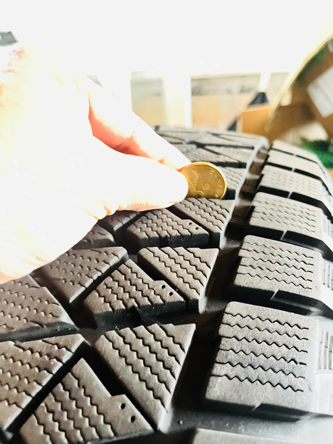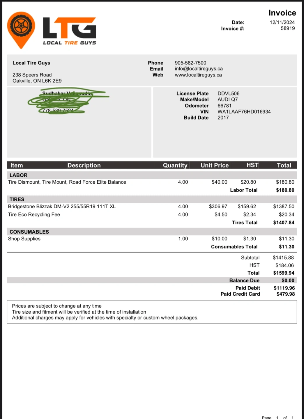 Selling a set of four Bridgestone Blizzak DM-V2 tires, size 255/55R19 111T XL. These tires were installed by Local Tire Guys on December 11, 2024, for an Audi Q7. The original invoice shows the total for the tires was $1407.84.