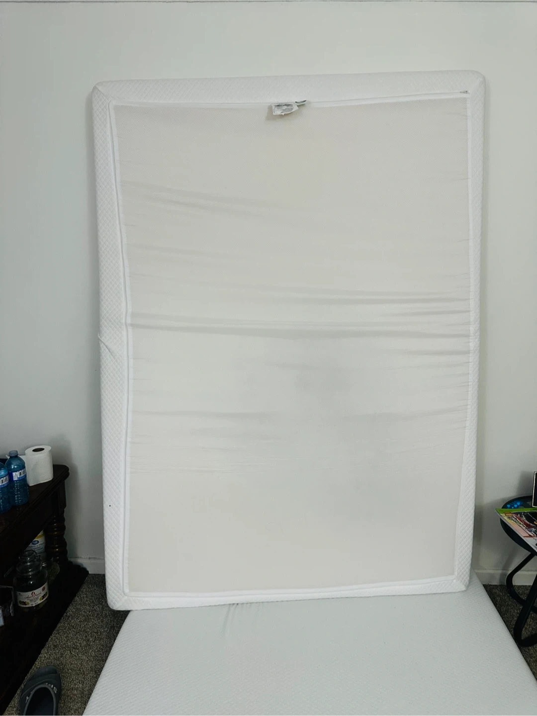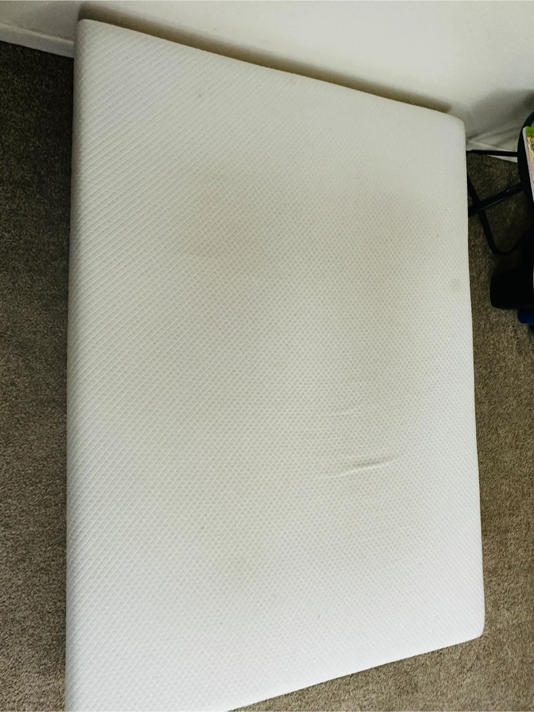 Selling a gently used mattress! It's white and has a textured surface. There are some minor signs of use, but it's still in good condition for a comfy sleep!