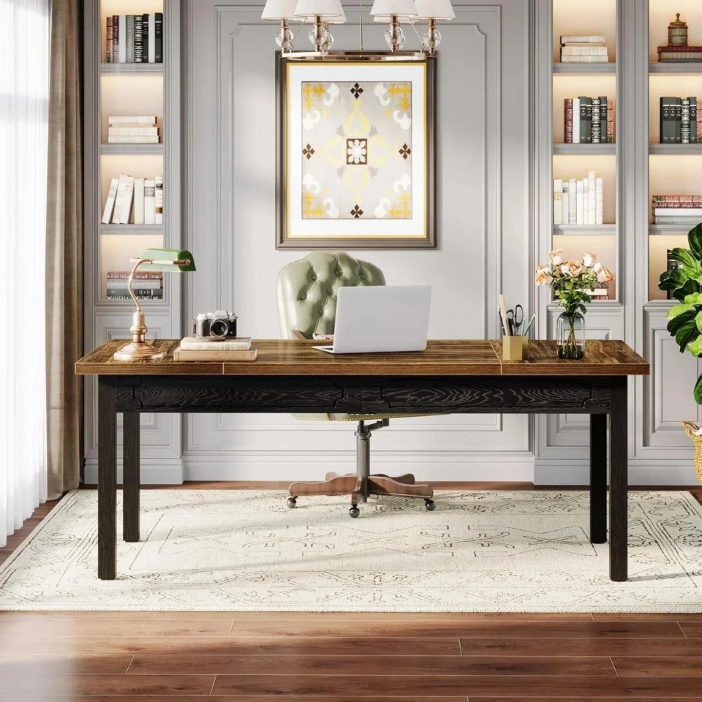 Sturdy Construction - This home office desk built with thick MDF and solid wood legs is durable, sturdy, and has a high weight capacity. Adjustable footpads keep it from wobbling. Elegant Design - A dark, textured wood finish and sturdy white legs give this 62" computer desk a sleek, professional look. Grooves on the legs add sophistication. Ample Work Area - With generous dimensions of 62.6"L x 31.1"W x 30.3"H, this desk provides plenty of workspace and legroom for folders, files, and more. Practical & Flexible - Suitable for office or training areas, the desk can function as a computer desk, executive desk, conference table, or even a dining or kitchen table in your home. Features: Metal Legs Brand: Tribesigns Assembled Product Weight: 62.83 lb Material: Engineered Wood, Metal Assembly Required: Yes Dimensions (L W H) 63.00 in 31.50 in 29.50 in
