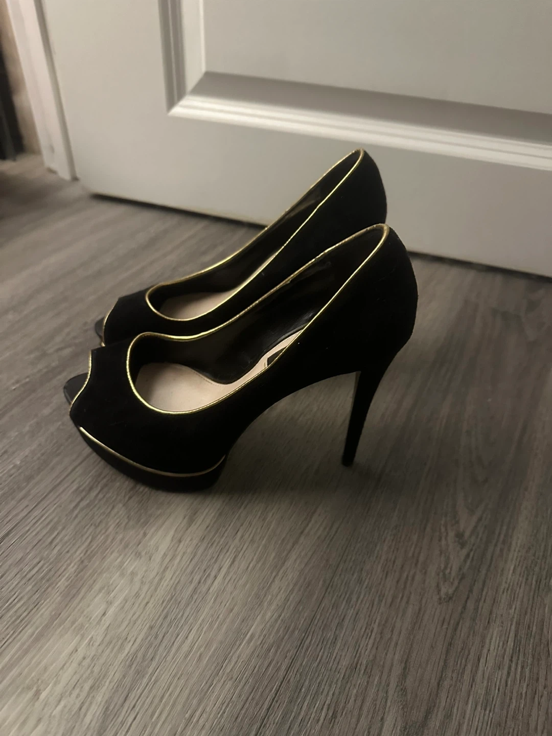 Buy & SellBlack Platform HeelsBlack Platform Heels$60These are a pair of black platform heels. They have a peep toe and gold trim. They are in great condition!ConditionLike newSize35 WHERE TO MEETCheck LocationView MapSELLERRoseNobleton100 reviews0 chats·0 favorites·2 viewsSEND CHAT TO SELLERHi Rose! I’m interested in your listing.Hi Rose! I’m interested in your listing.Get the Karrot app to chatSign In to chat