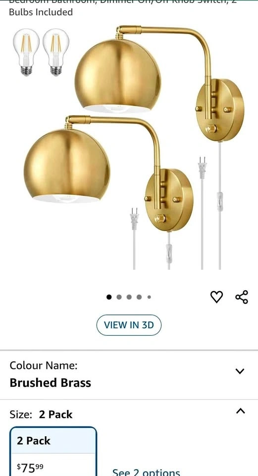 Plug in Wall Sconces, Dimmable Wall Sconce Swing Arm Wall Lights with Plug in Cord and Dimmer On/Off Knob Switch, Brushed Brass Globe Wall Light for Bedside Bedroom Bathroom (2 Bulbs Included).
