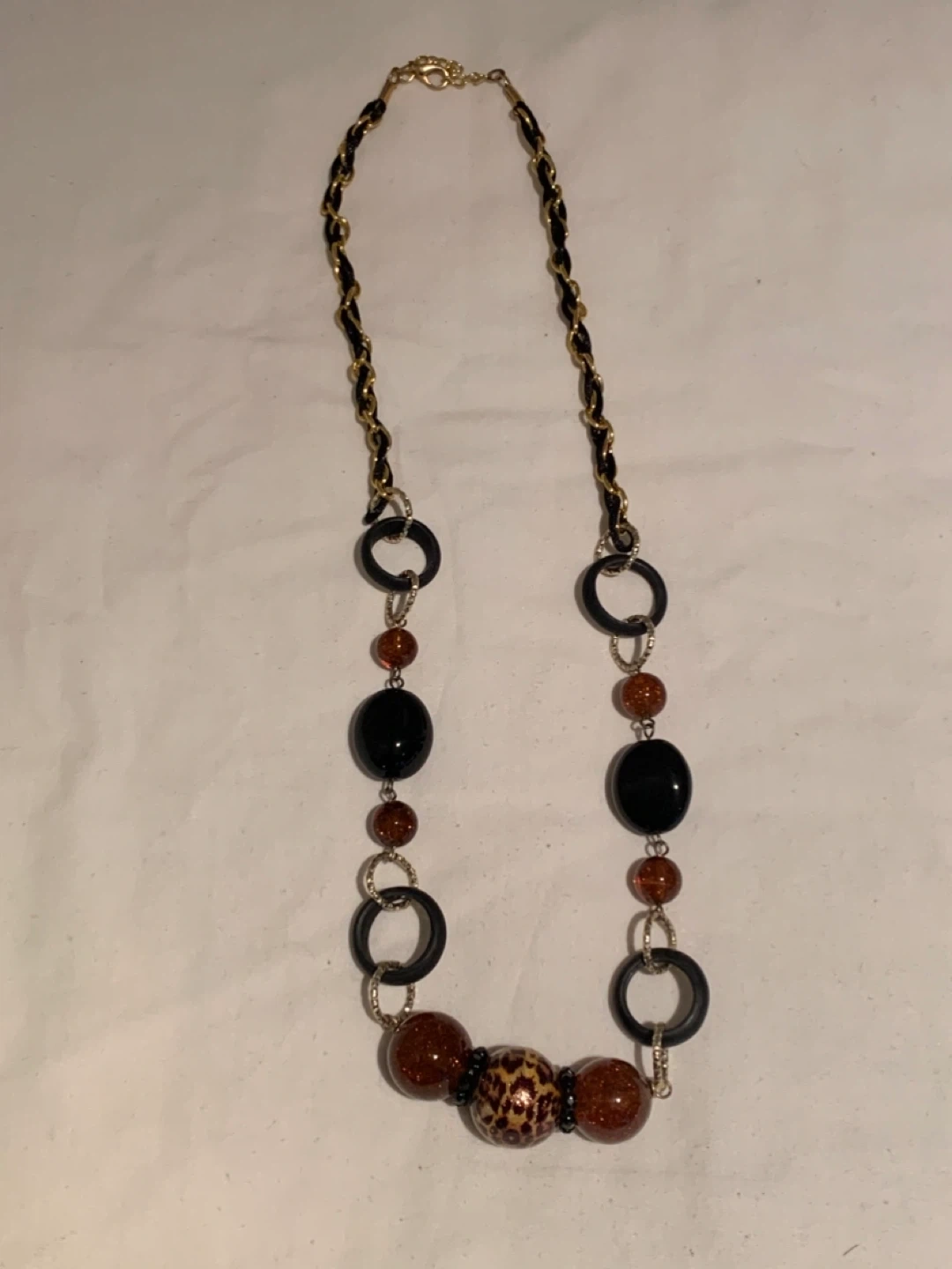 This necklace features a mix of black, brown, and gold tones, with a unique leopard print accent bead. It's in great condition and ready to add a touch of style to any outfit