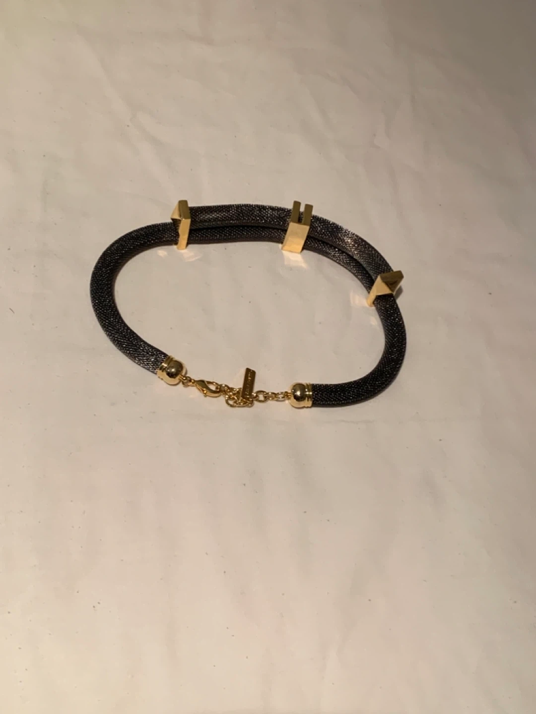Selling a Swarovski Stardust Double Bracelet in black. It's in great condition and features a black nylon fishnet tube filled with sparkling crystals, creating a 3D silhouette. The bracelet is finished with a gold-plated magnetic clasp. A stylish and eye-catching accessory!