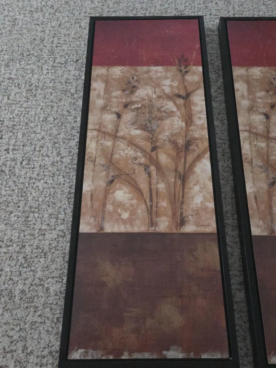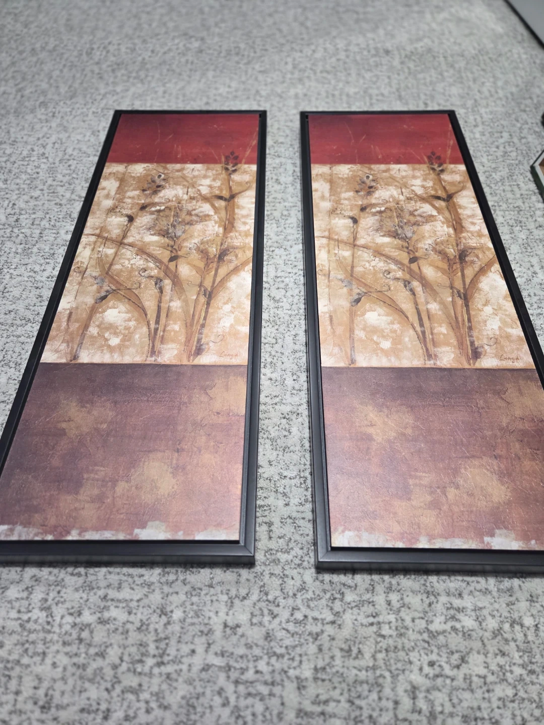 Selling a set of two framed wall art prints. They feature a modern design with earthy tones and a black frame. These prints would look great in any living room, bedroom, or office space!