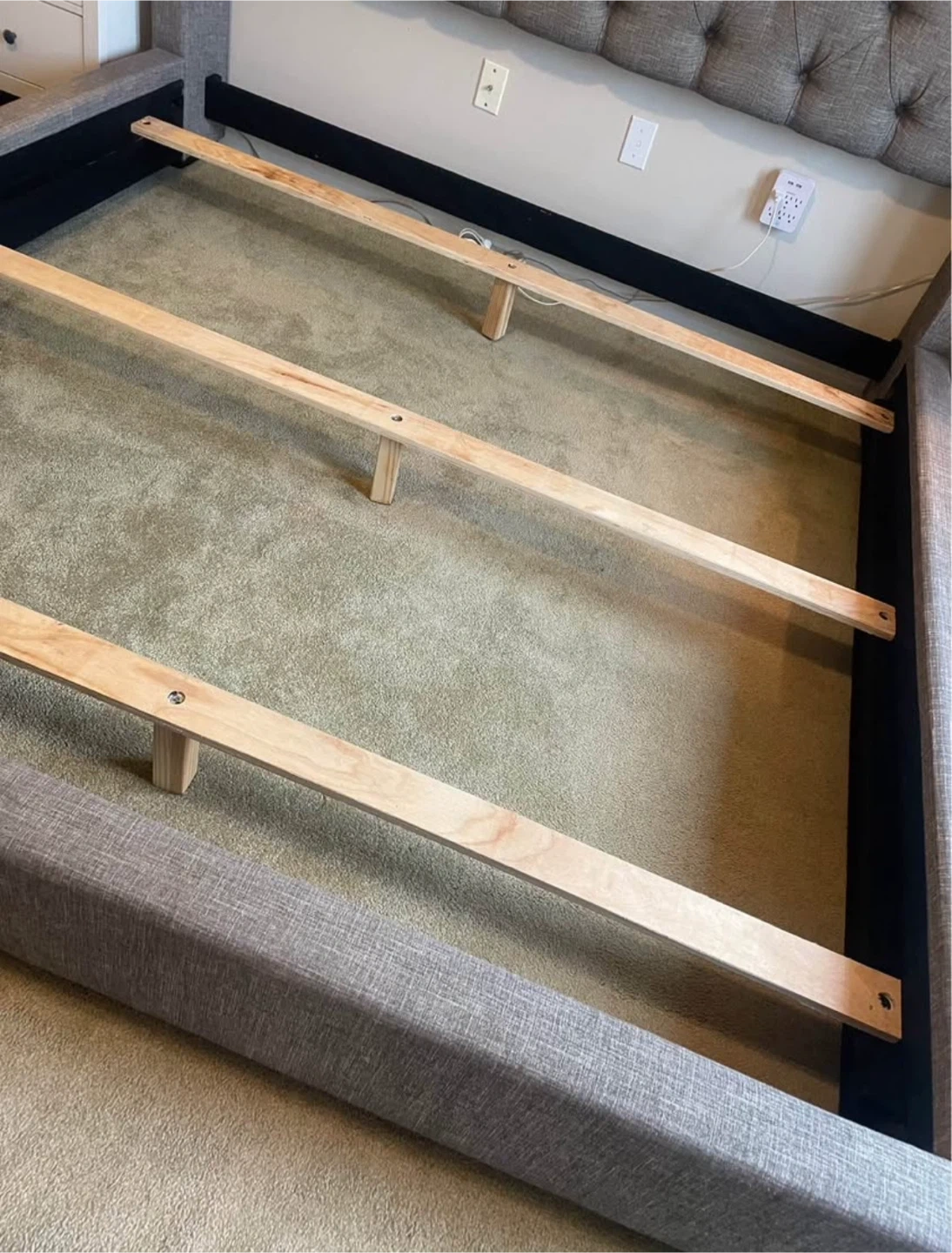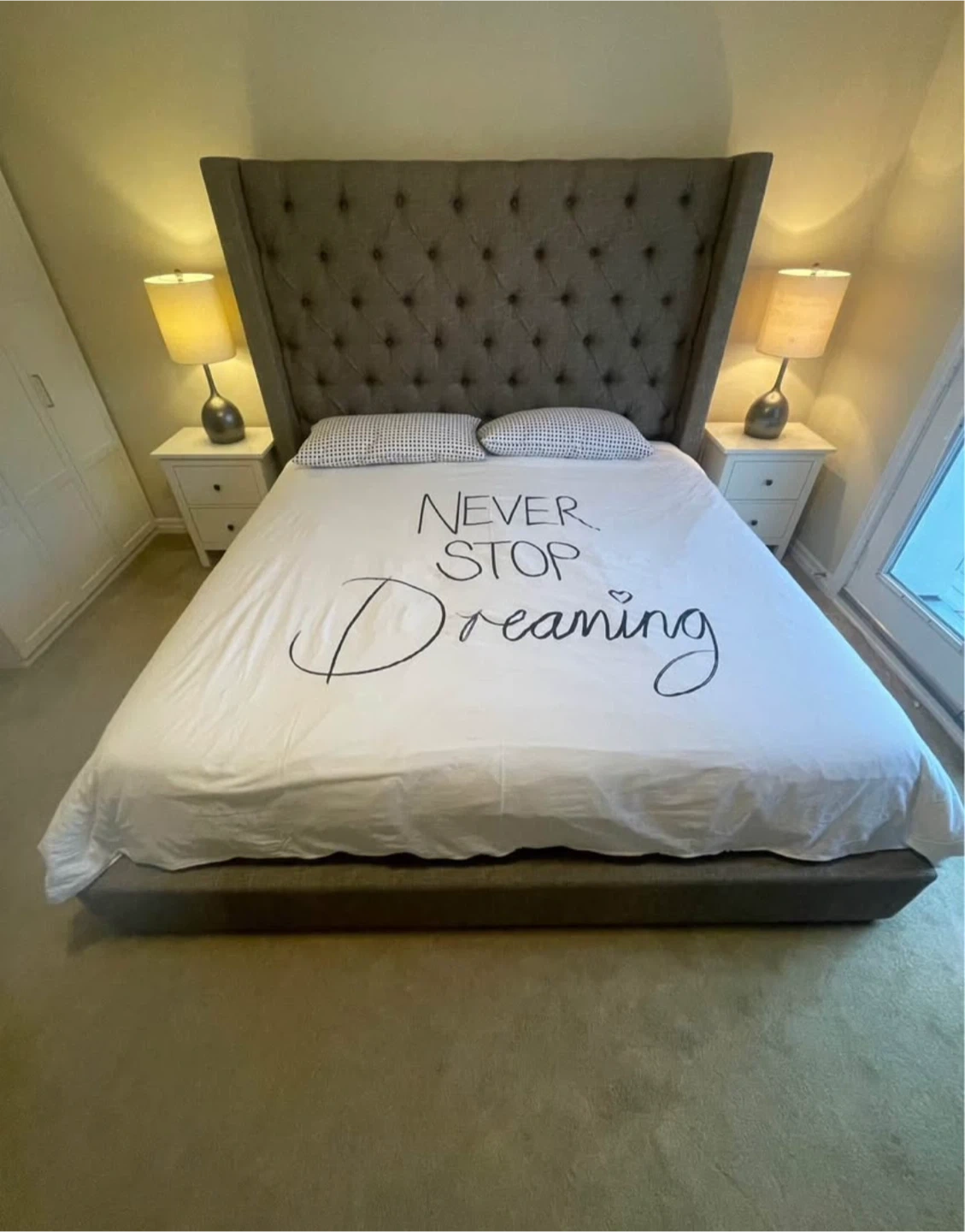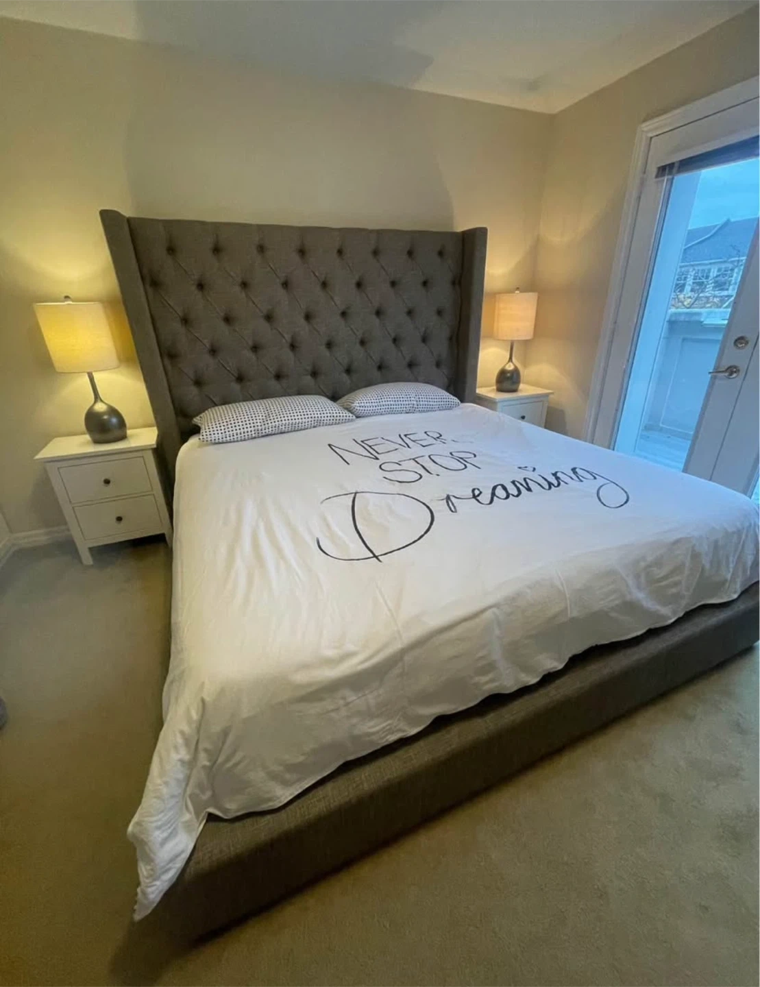 Selling a beautiful upholstered wingback headboard bed frame! It's in great condition and would be a lovely addition to any bedroom. The headboard features a tufted design, adding a touch of elegance and comfort. King size bed.