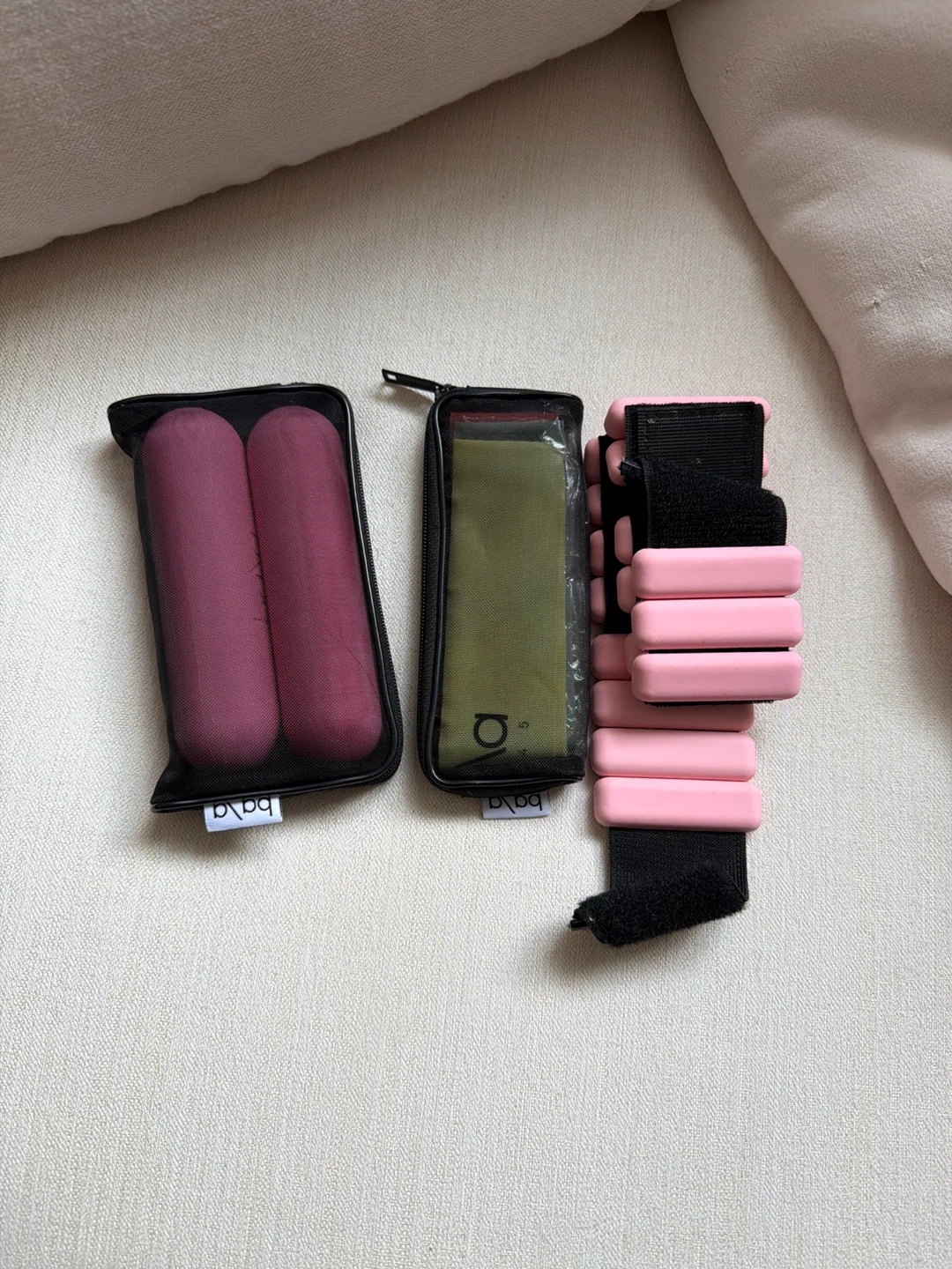 Get ready to level up your workout with this Bala Bangles set! Includes pink wrist weights, maroon bars, and olive green bars, all in great condition and ready to use. Perfect for adding a little extra resistance to your yoga, pilates, or everyday walks