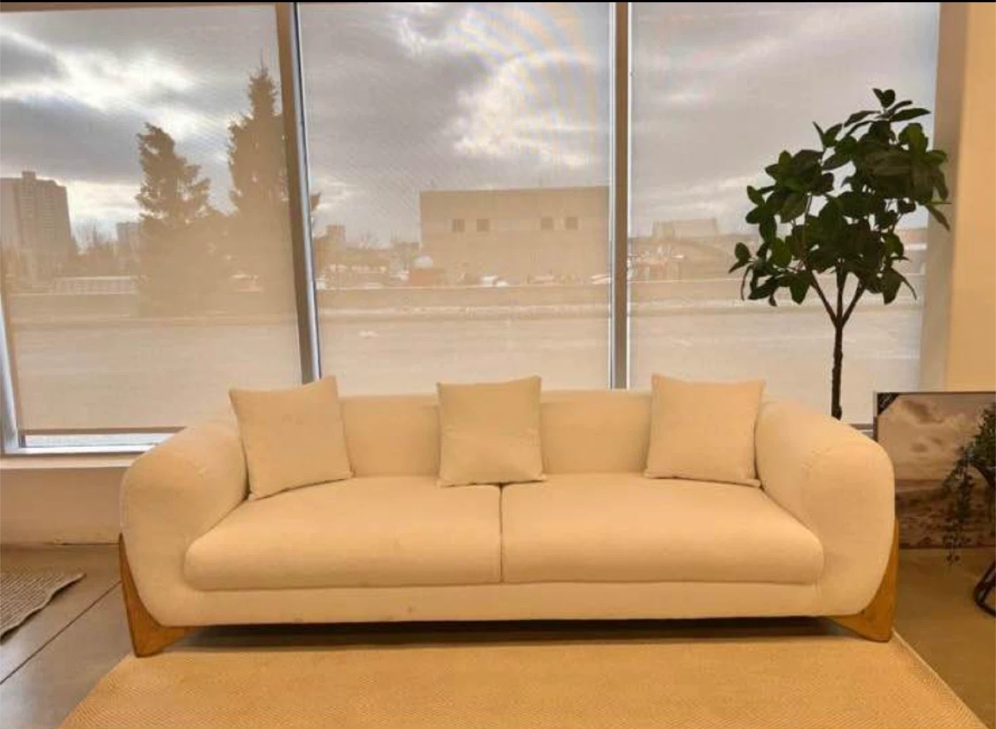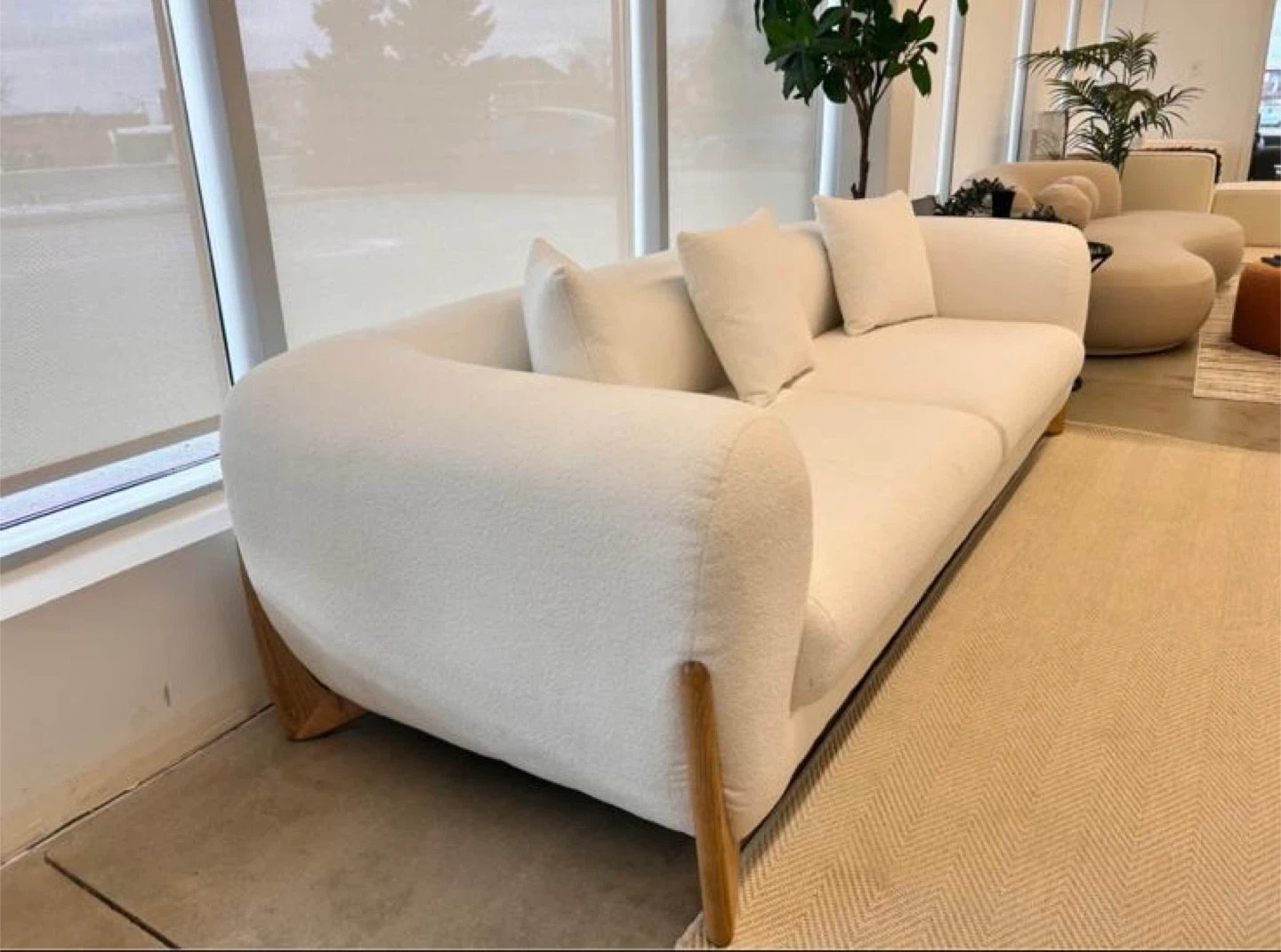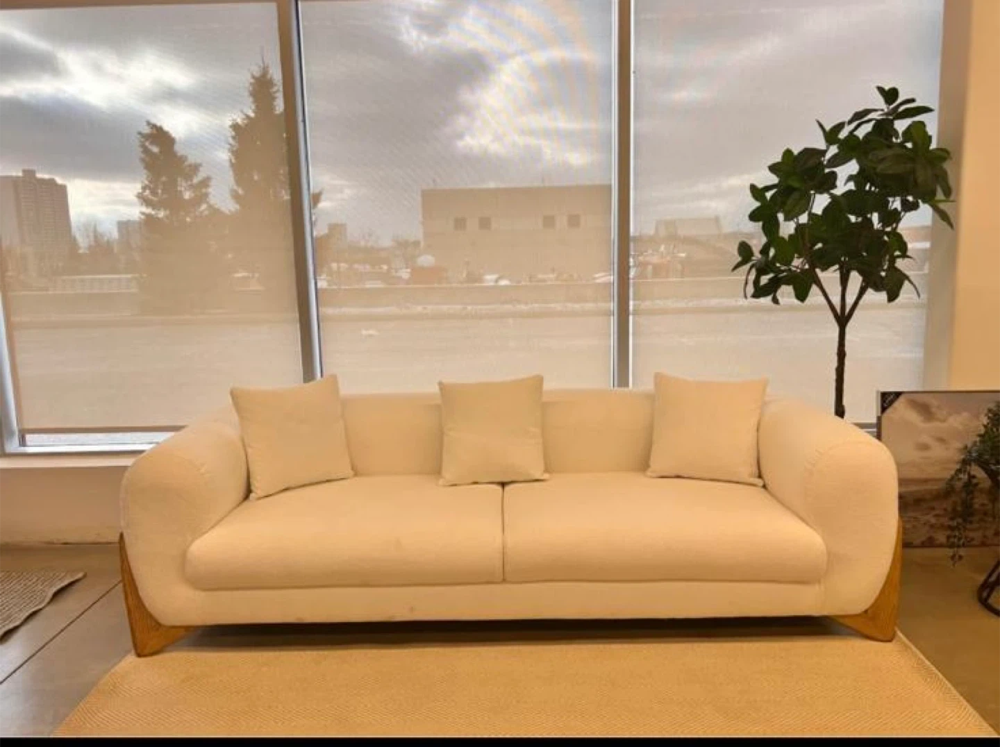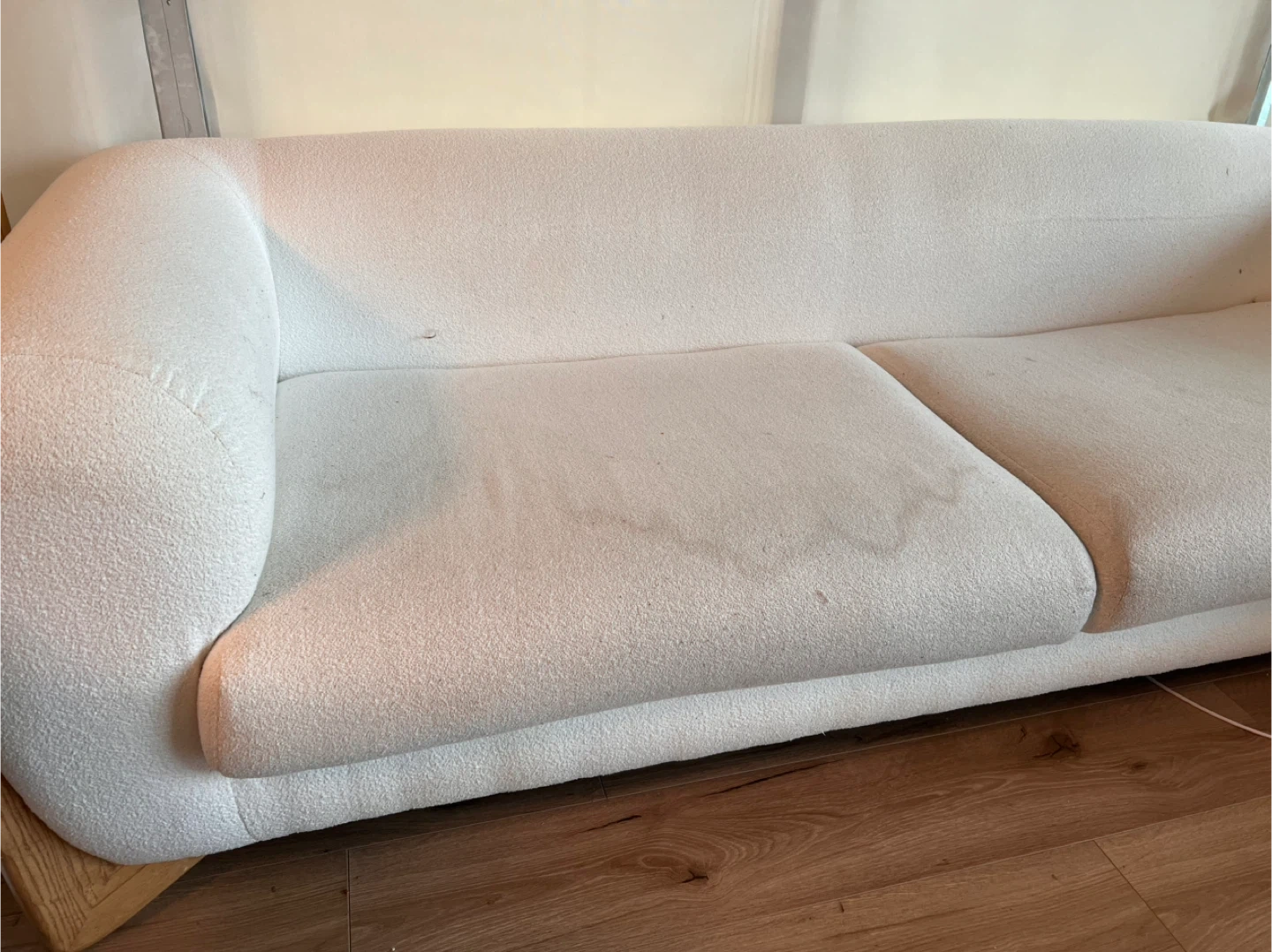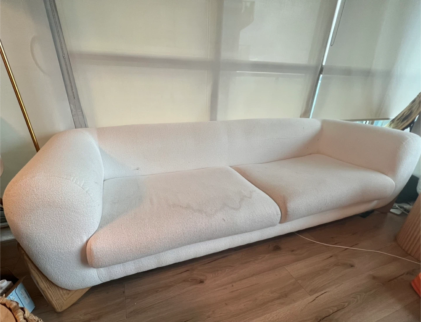 Selling a white boucle sofa. It's a stylish piece, but unfortunately, there are some stains on the cushions as shown in the pictures. Could be a good project for someone who's handy with upholstery cleaning!