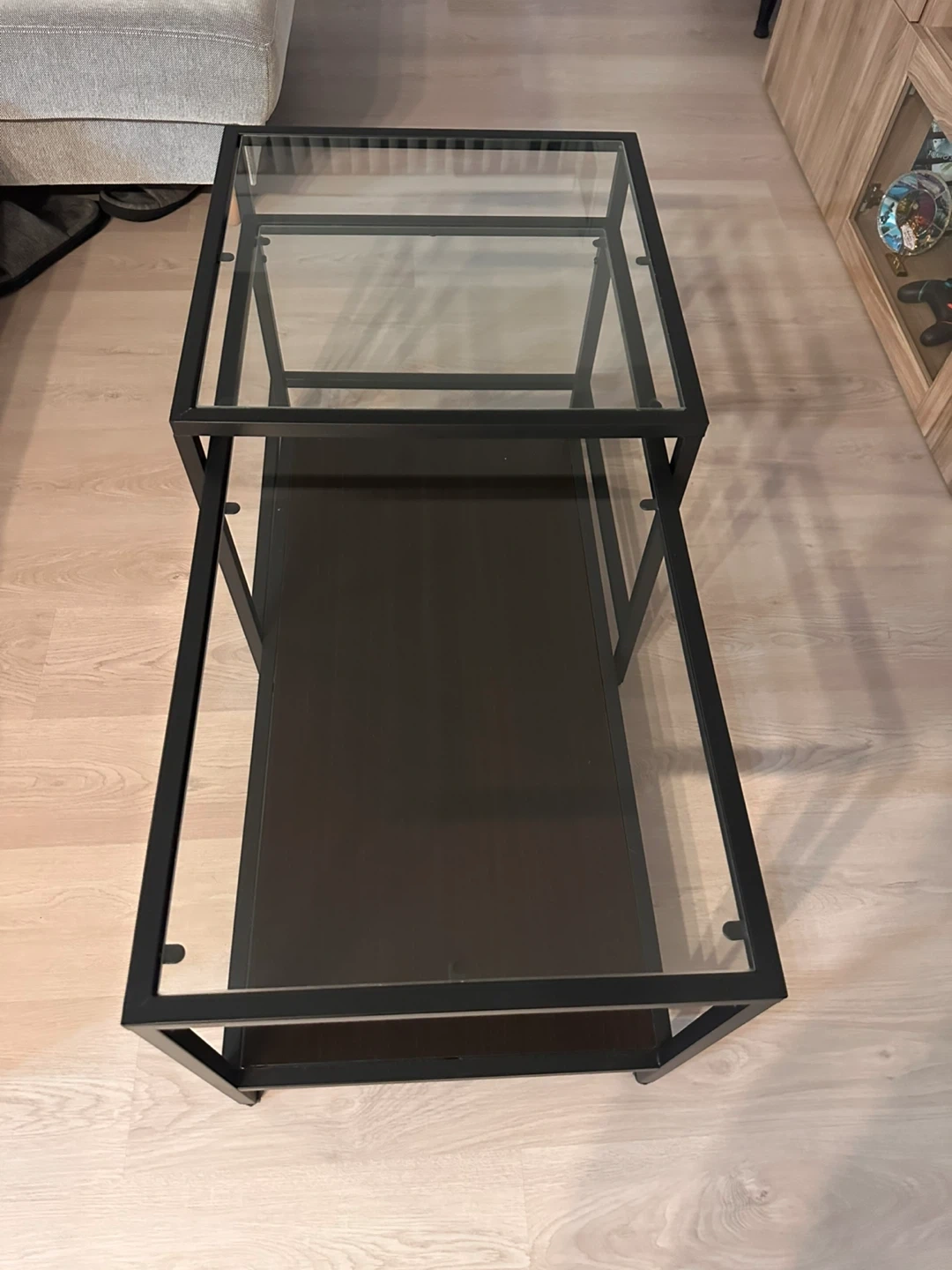 Selling a set of nesting coffee tables. They have a black frame and a glass top. Great for saving space and adding a modern touch to your living room!