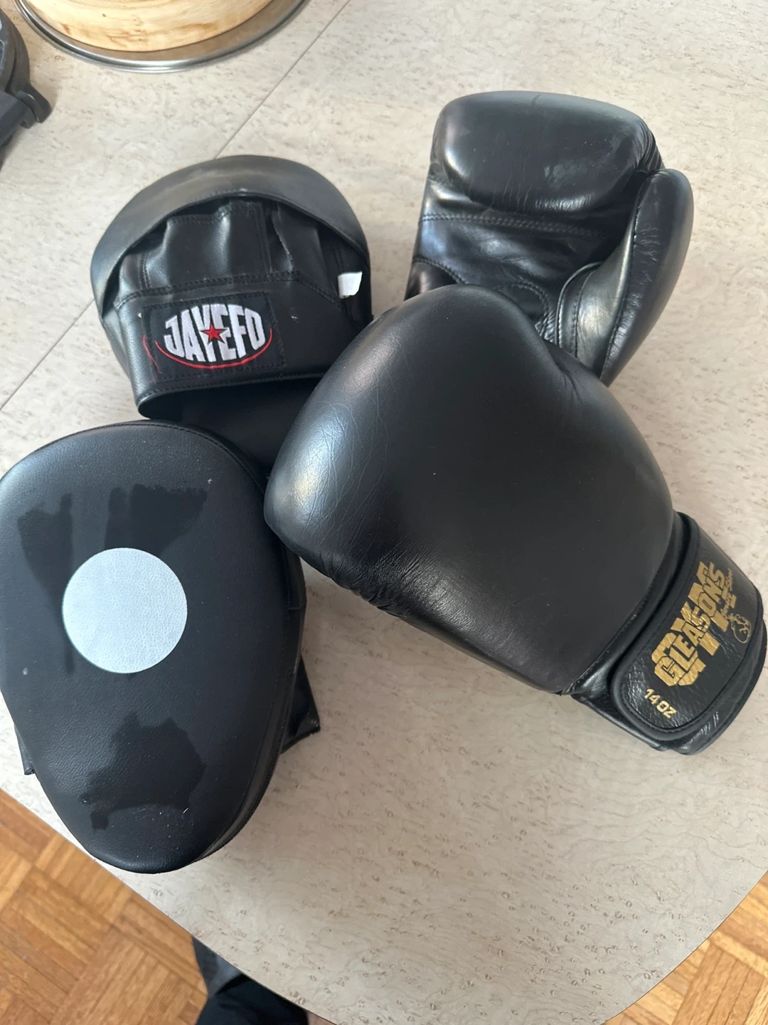 Selling a set of boxing gear including 14 oz. Cleto Reyes boxing gloves branded from Gleason’s gym, for all intents the white house of boxing, and JAYEFO focus mitts. The gloves are 14 oz and in black. Offers welcome