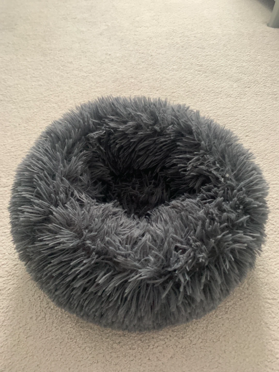 Selling a comfy grey plush donut pet bed! It's in great condition and perfect for your furry friend to curl up and nap in. The soft, shaggy material will keep them cozy and warm