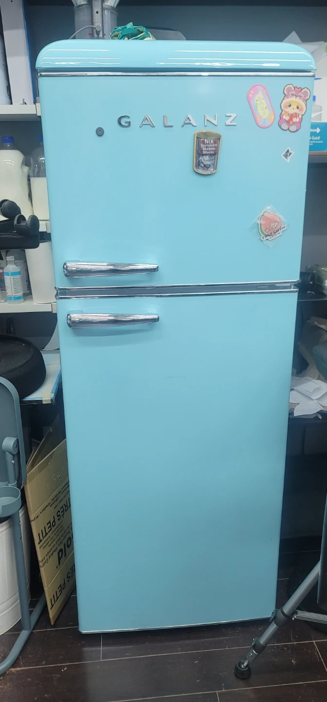 Selling a Galanz retro refrigerator in a lovely light blue colour. It's a real statement piece for any kitchen, adding a touch of vintage charm! It's in great condition..but..