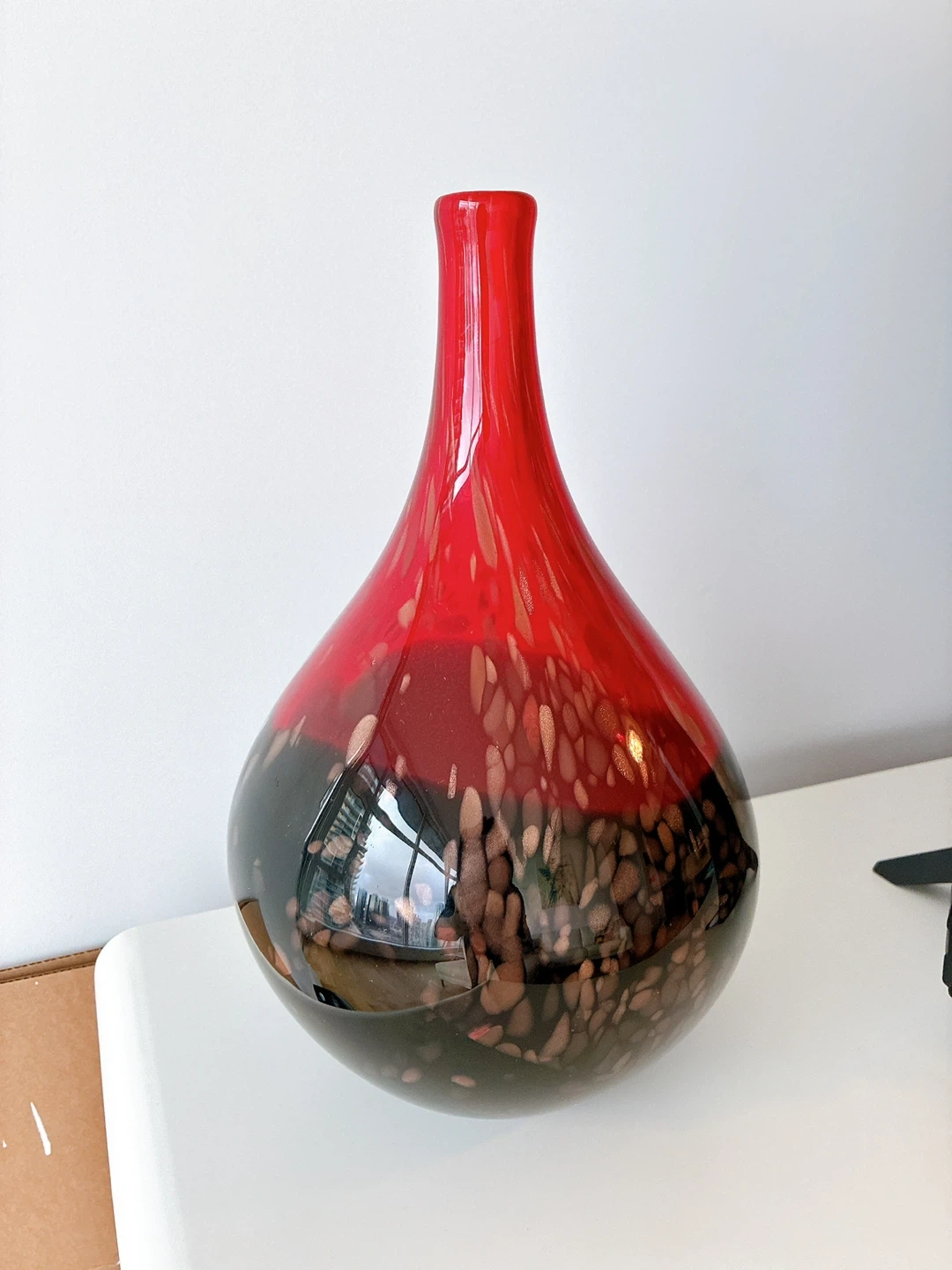 Beautiful decorative glass vase in excellent condition! The vase features a striking combination of red and black colours, with a unique speckled pattern towards the base. It would make a lovely addition to any home decor.
