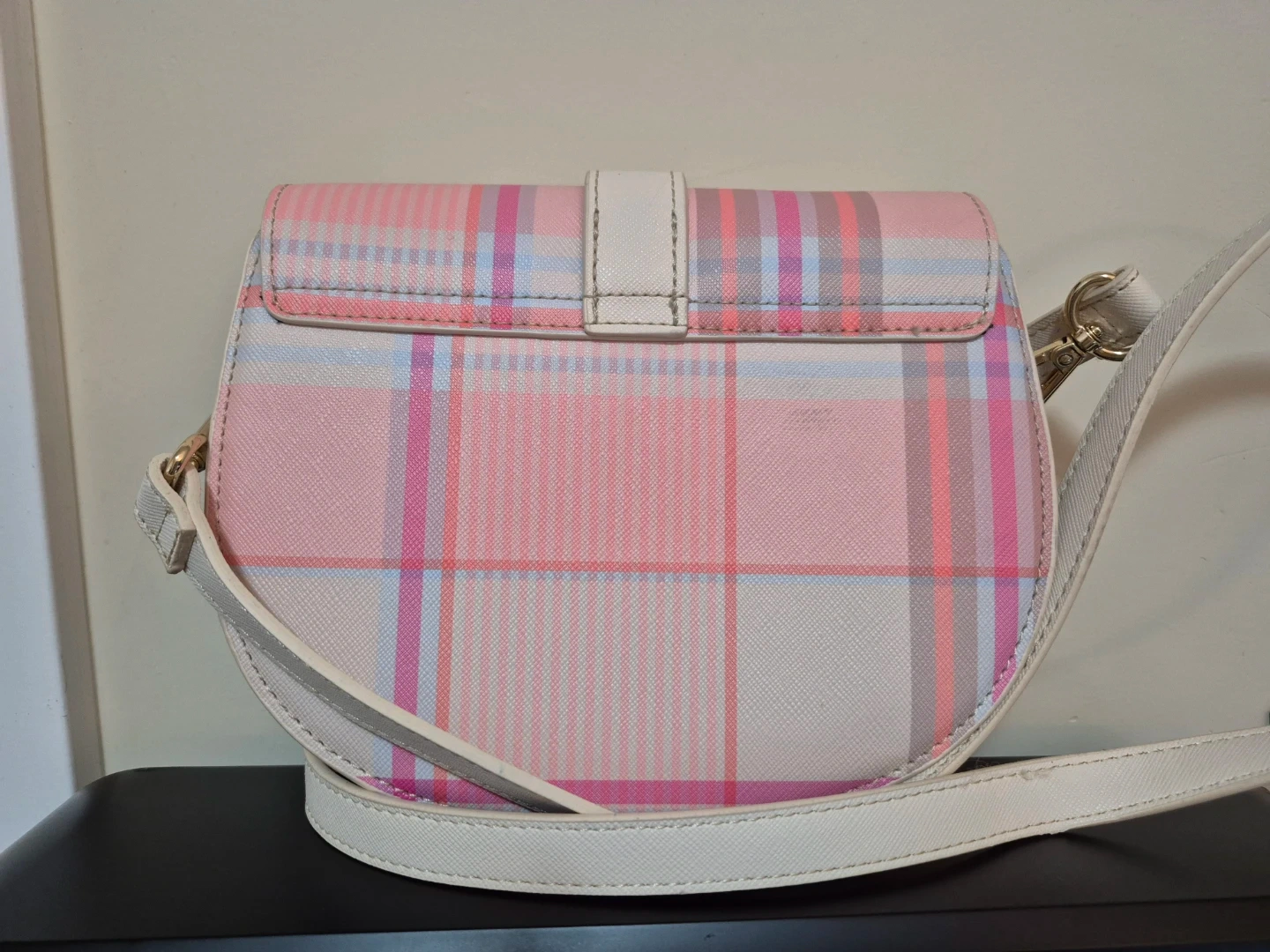 Here's a cute Tommy Hilfiger crossbody bag! It features a pink and white plaid pattern with a white strap and a magnetic closure. The bag is in great condition and perfect for everyday use.