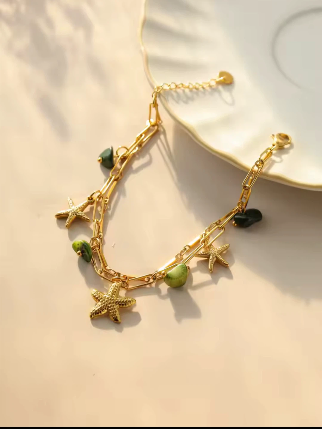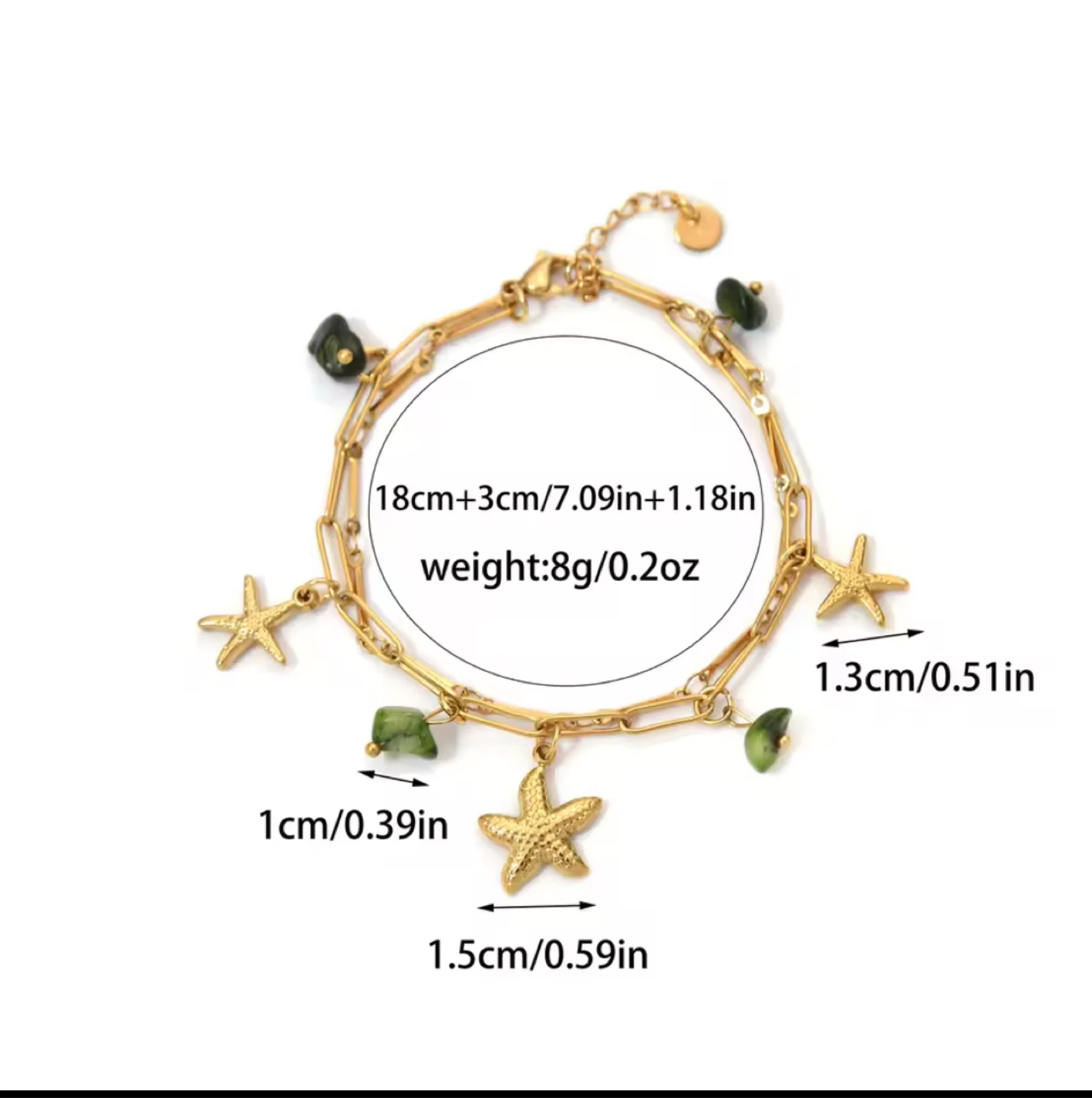 This is a cute gold chain bracelet featuring starfish charms and green stone accents. It's lightweight at only 8g/0.2oz and has an adjustable length of 18cm+3cm/7.09in+1.18in. The starfish charms are about 1.5cm/0.59in in size, and the green stones are around 1cm/0.39in