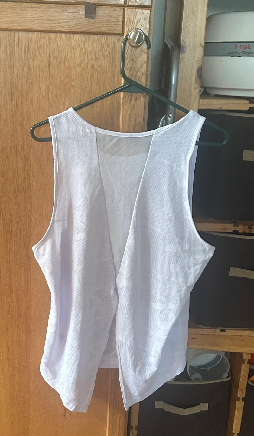This is a Shein white tank top in size XL. The material is 90% polyester and 10% spandex. It's machine washable too! Great for workouts. Lightly worn